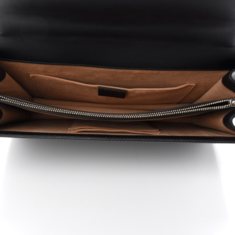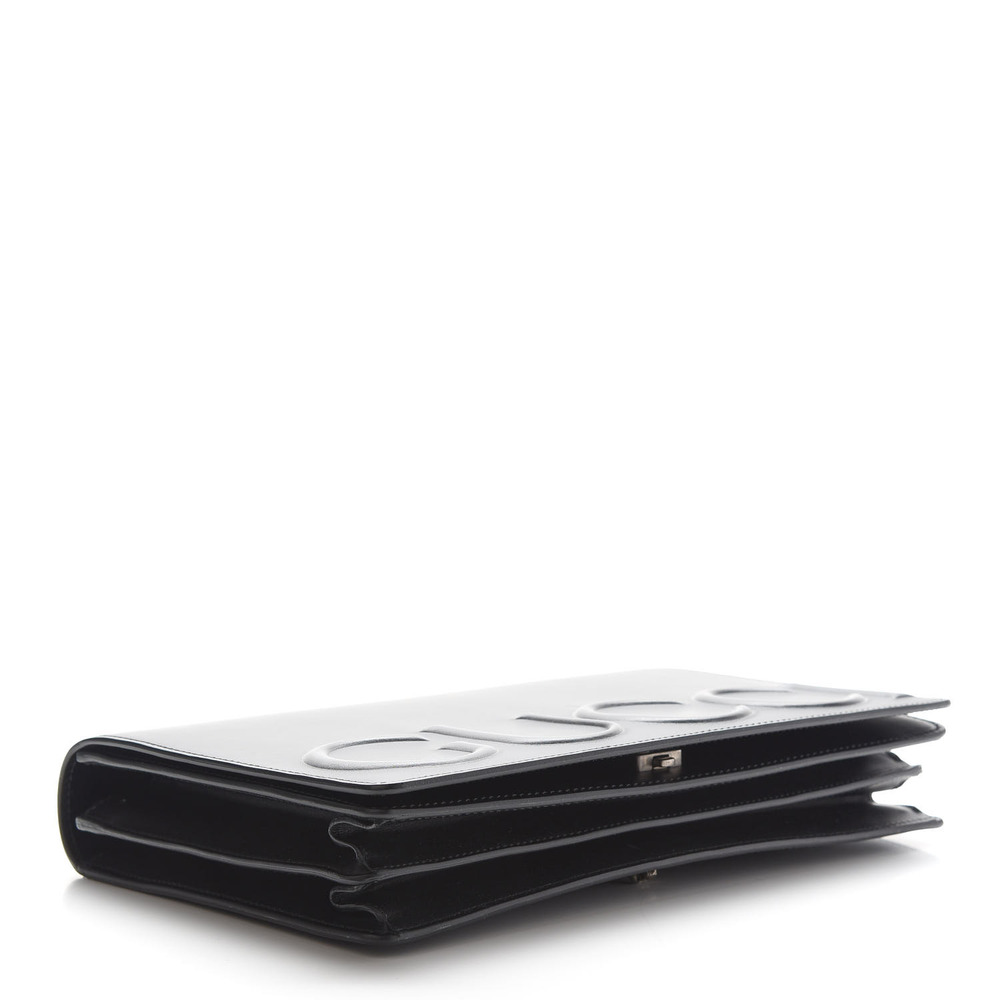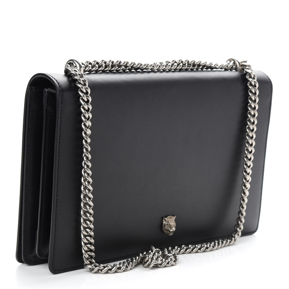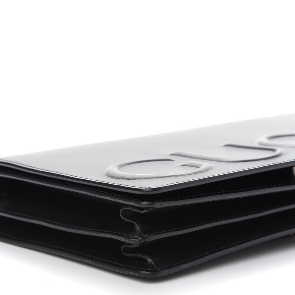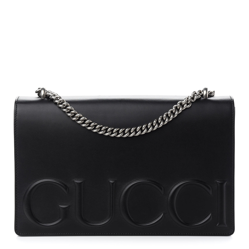 GUCCI Calfskin Embossed XL Chain Strap Shoulder Bag in Black. This shoulder bag is crafted of smooth calfskin leather in black with a prominent embossed Gucci logo. The bag features an aged silver chain-link shoulder strap, and opens to a partitioned beige suede leather interior with card slots, patch pocket, and a zipper compartment.