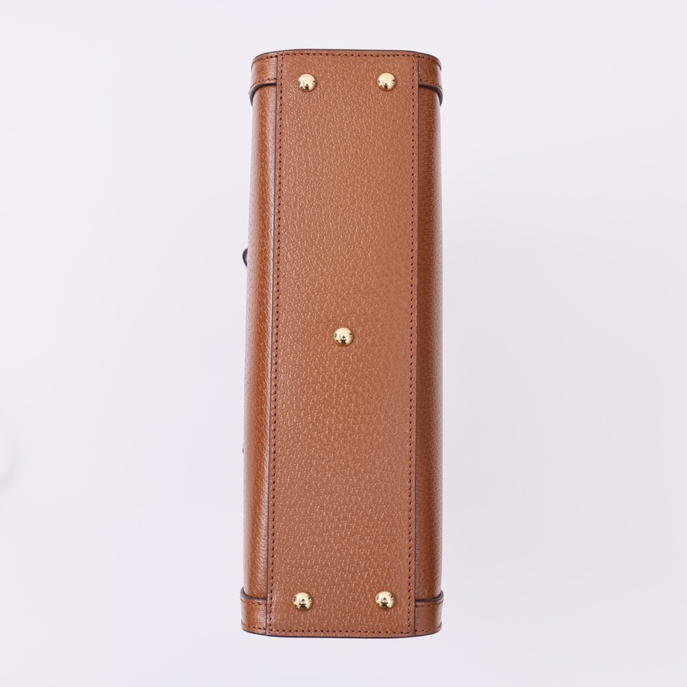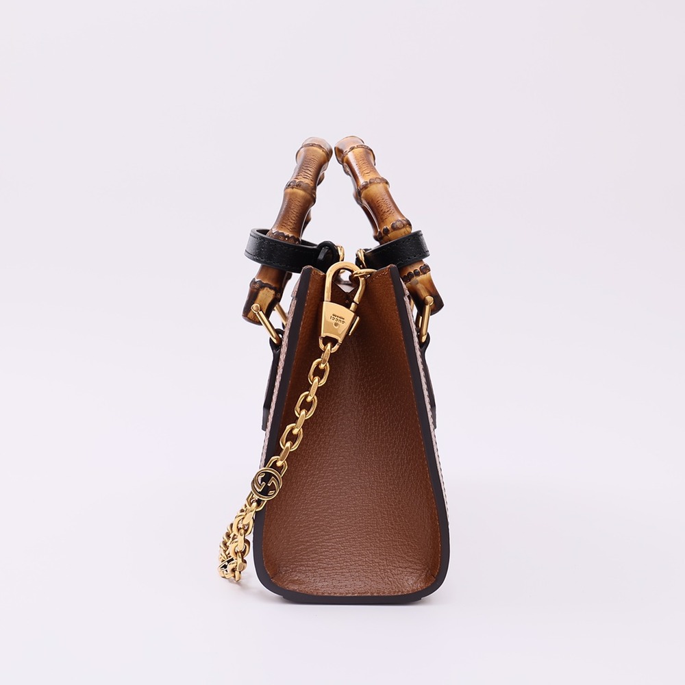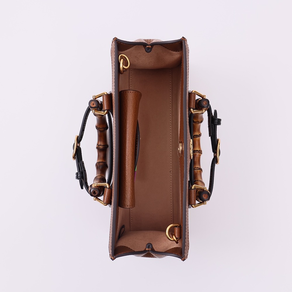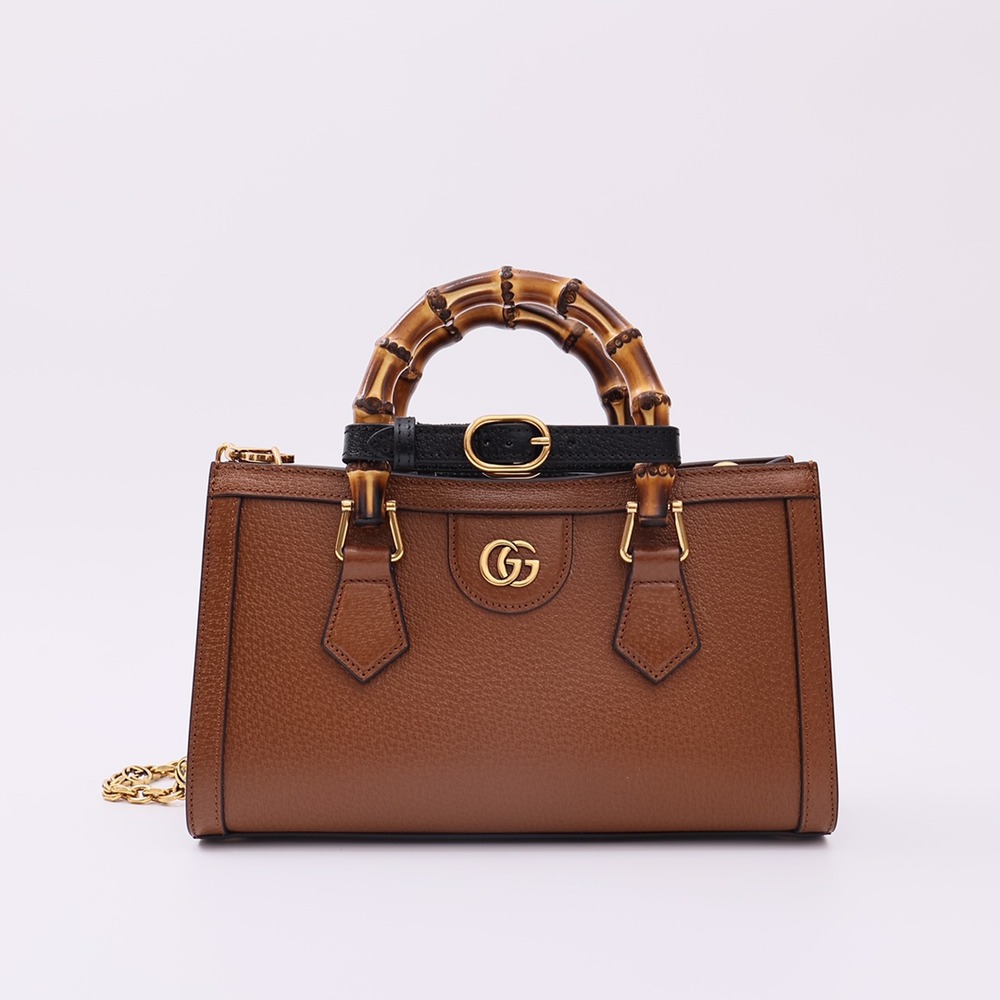 A new shape for Cruise 2023 Gucci Cosmogonie, the Gucci Diana continues to combine recognisable elements of the House with the bamboo handles and Double G hardware. Crafted from brown leather, the accessory is further accentuated by two decorative leather belts, a playful reference to the bands used to keep handles in shape.