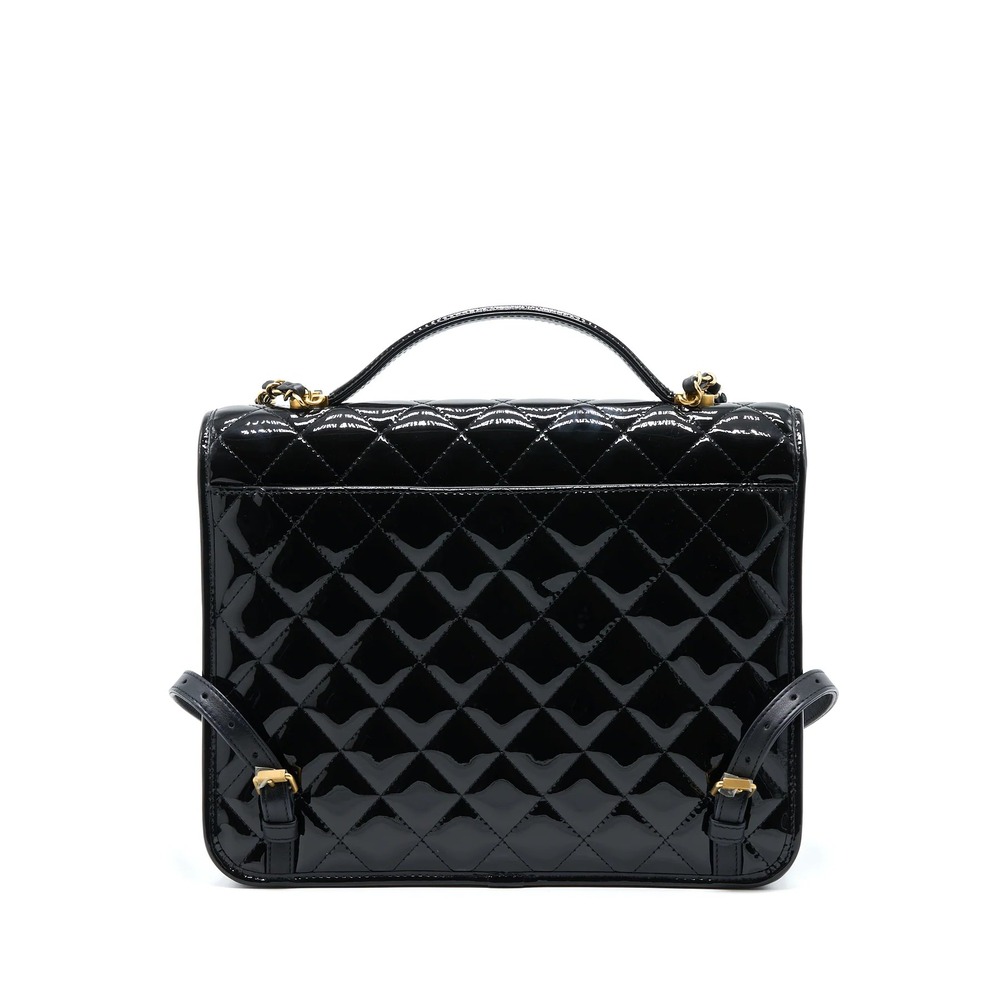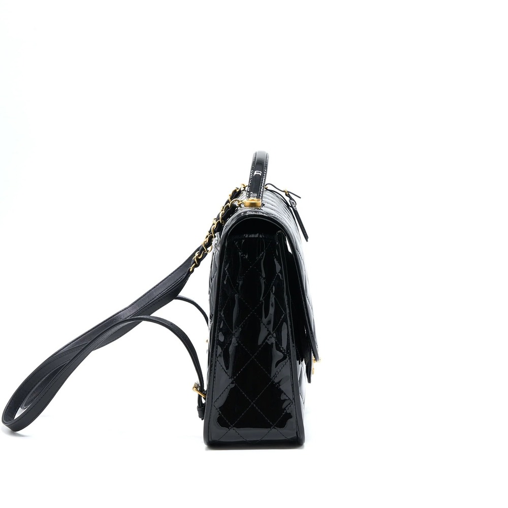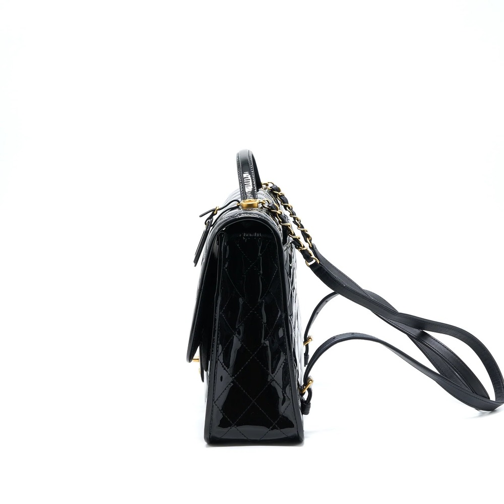 This vintage backpack is crafted of traditional diamond quilted black patent leather. The bag features leather straps with gold chain links threaded with leather and a top flap with the classic and iconic gold-tone Chanel CC Mademoiselle turn lock. The top flaps opens to a zipper compartment with matte black leather interior with zipper and patch pockets. This backpack from Chanel is ideal for everyday essentials.