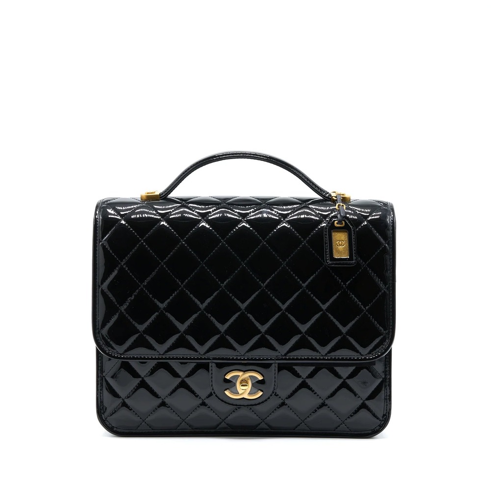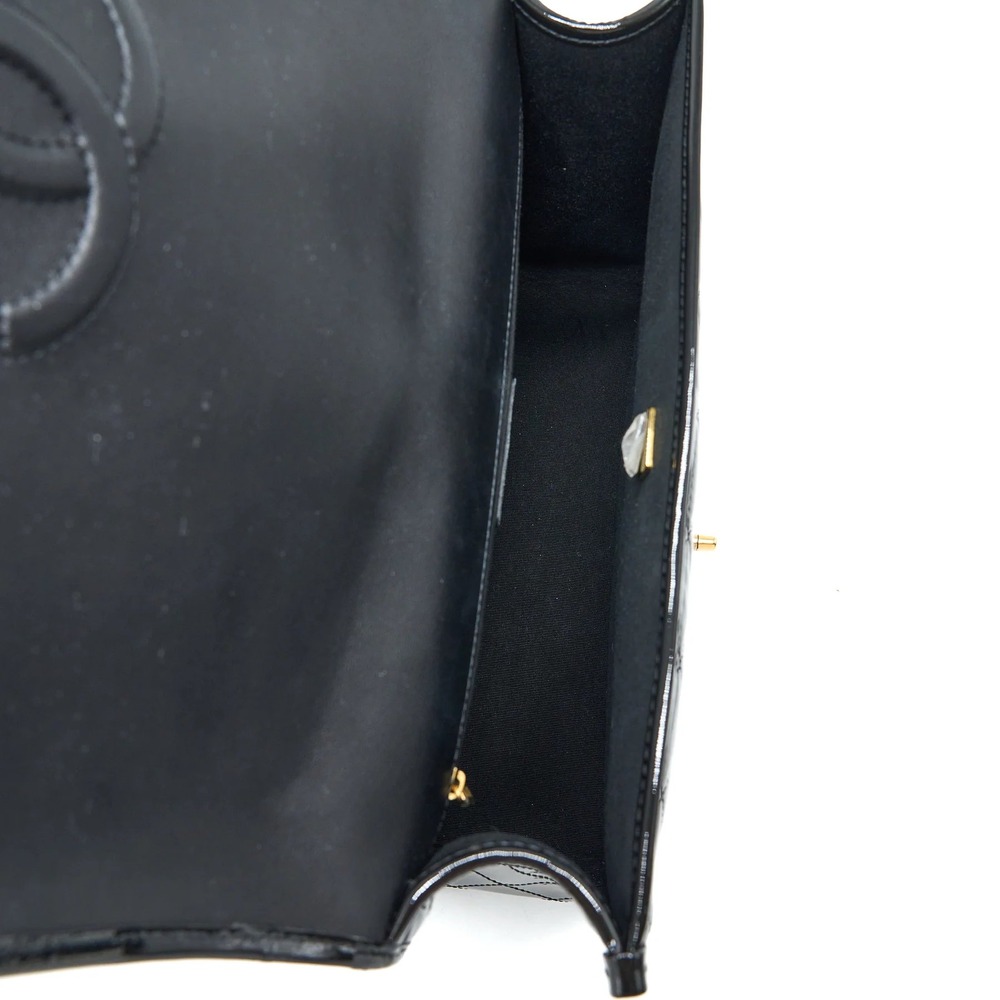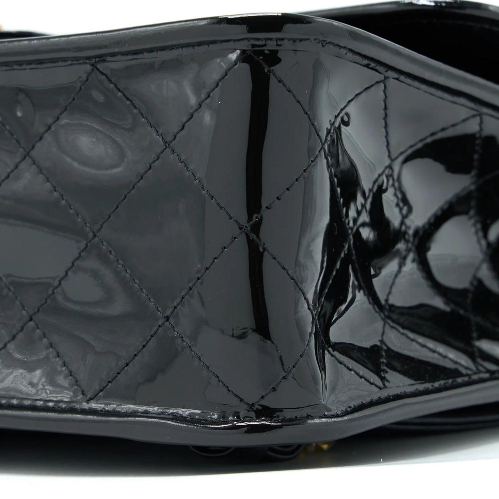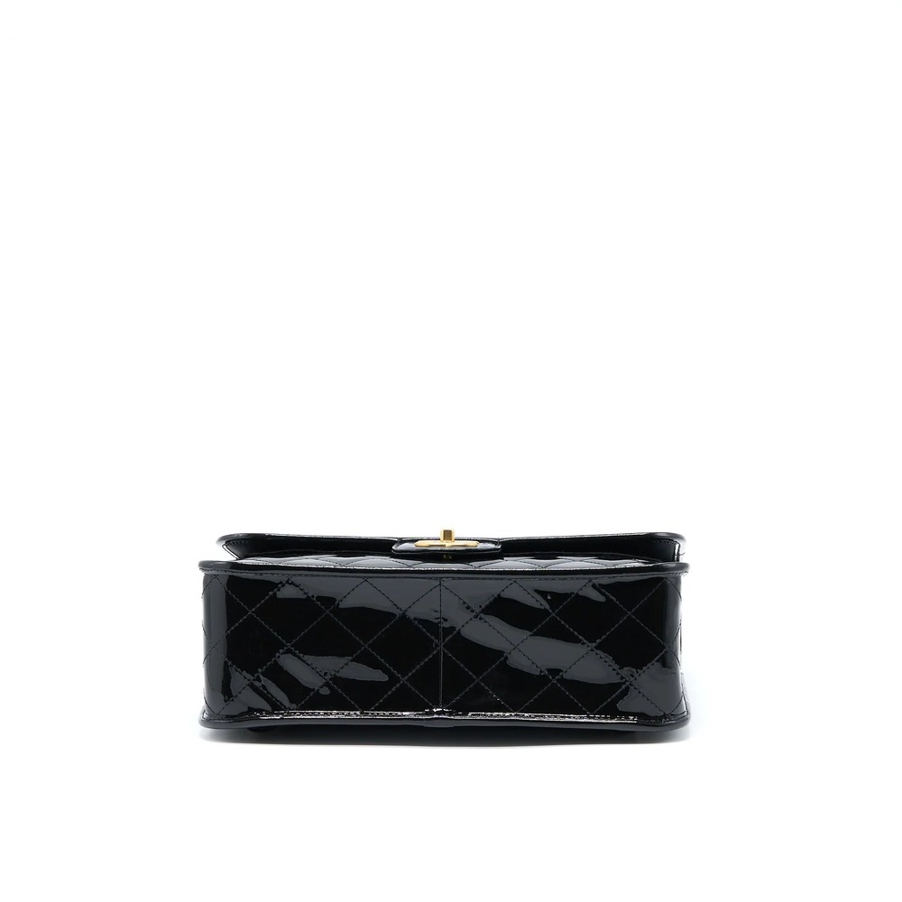 This vintage backpack is crafted of traditional diamond quilted black patent leather. The bag features leather straps with gold chain links threaded with leather and a top flap with the classic and iconic gold-tone Chanel CC Mademoiselle turn lock. The top flaps opens to a zipper compartment with matte black leather interior with zipper and patch pockets. This backpack from Chanel is ideal for everyday essentials.