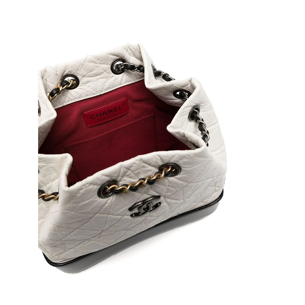 An authentic Chanel backpack crafted in diamond-stitched patent goatskin leather with white and black patent leather base, adorned with gold and silver ruthenium chain-threaded black leather straps. Spacious and stylish, perfect for everyday essentials.
