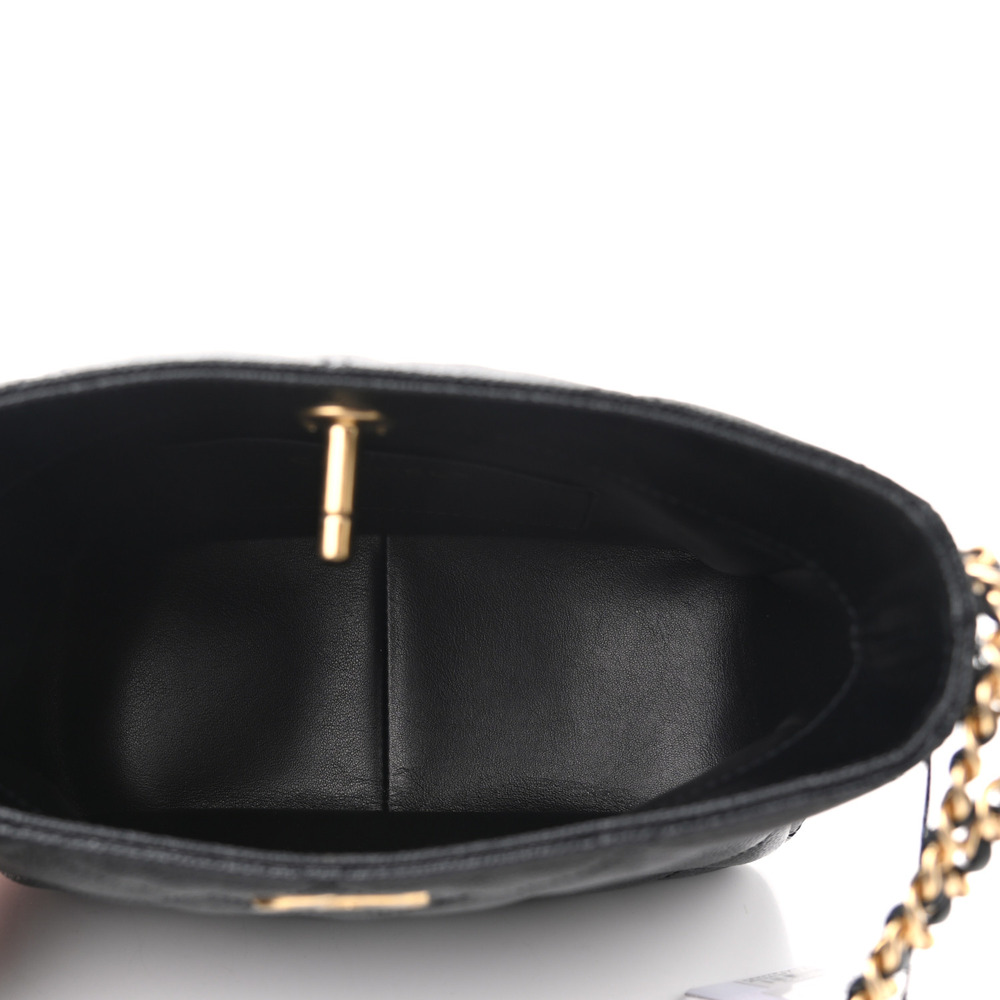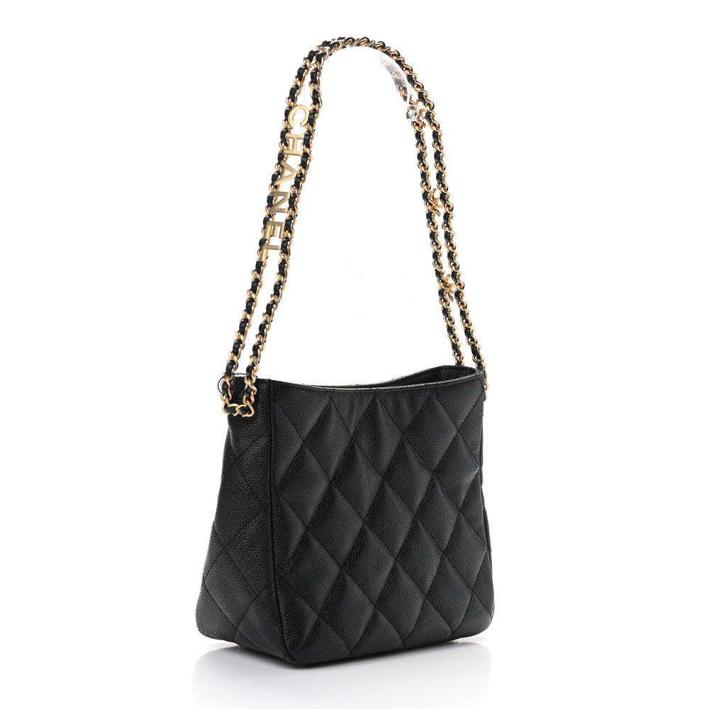 This sleek shoulder bag is featured in diamond stitched caviar leather in black. The crossbody bag features a double leather threaded aged gold chain shoulder strap with the Chanel logo spelled out in between. The top aged gold CC turn lock opens to a smooth black leather interior with a patch pocket.