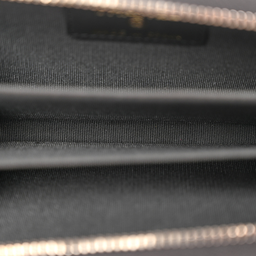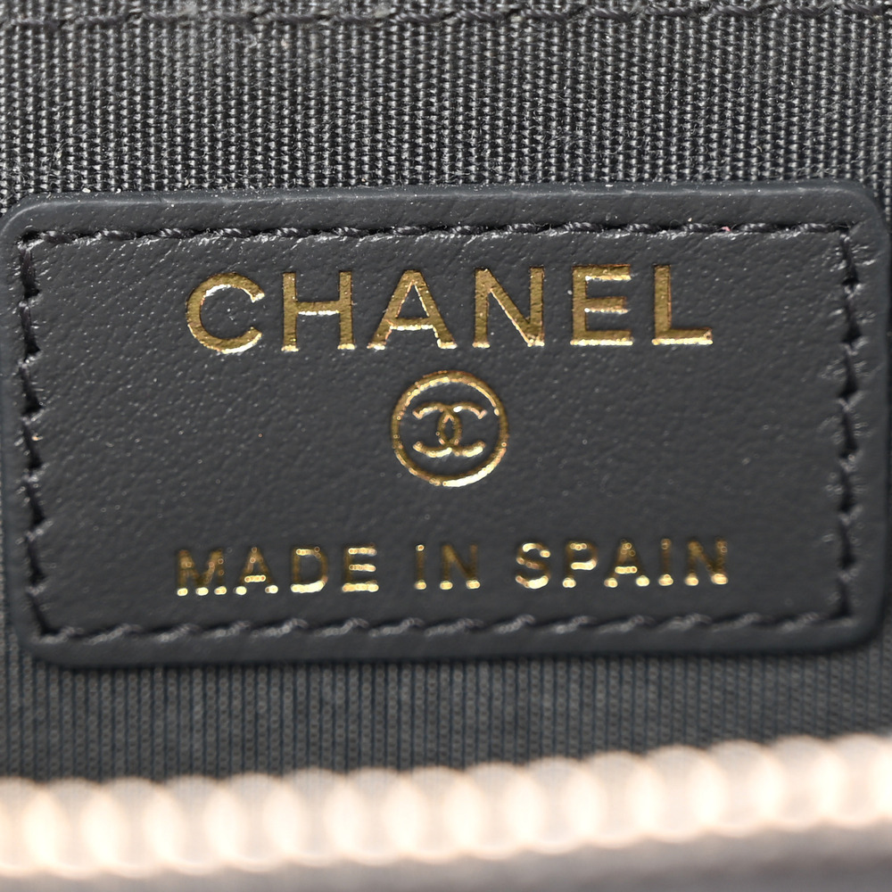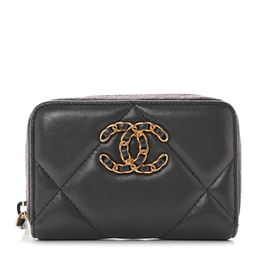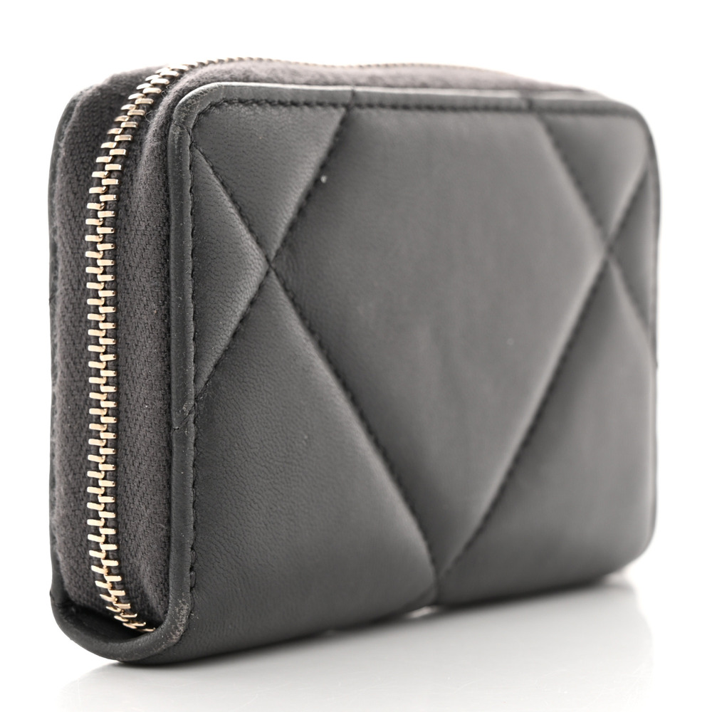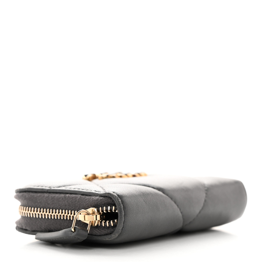 Crafted from beautiful diamond-quilted lambskin leather in light grey, this stylish wallet exudes elegance. It features a large leather-threaded aged gold Chanel CC logo on the front for a touch of sophistication. Opening with a wrap-around zipper, the wallet reveals a partitioned matching fabric interior for organized storage of your essentials.