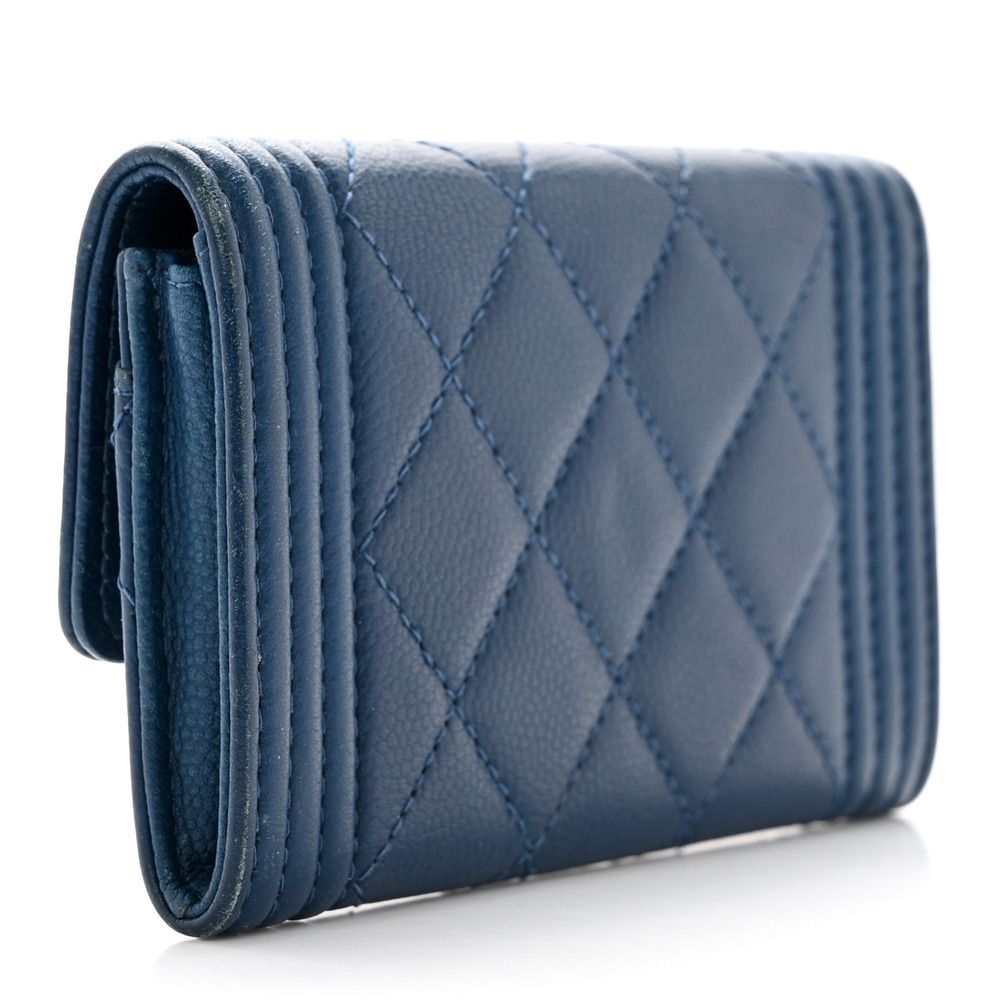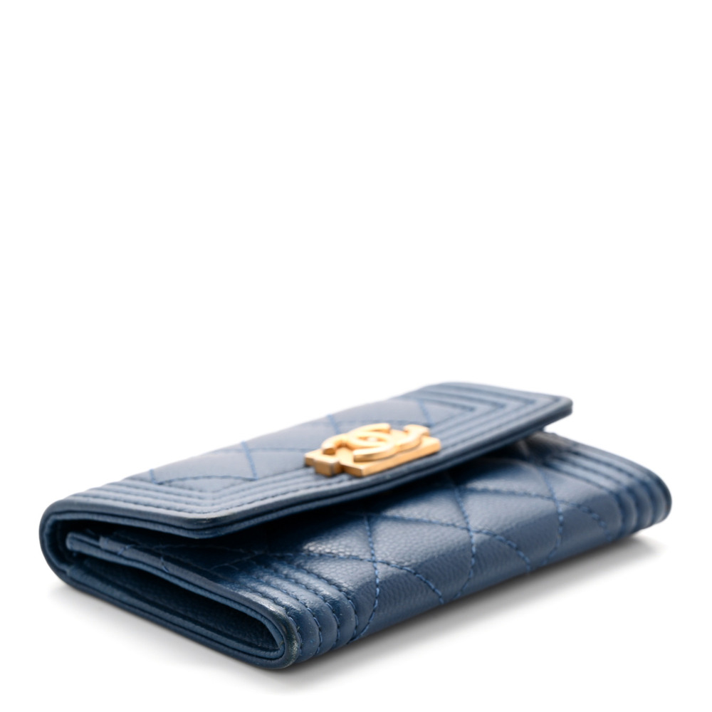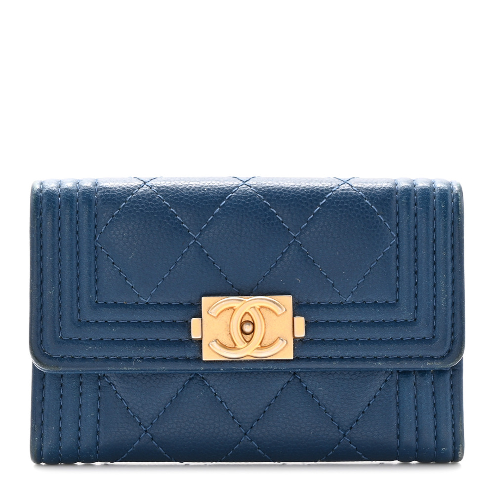 This stylish wallet is crafted of beautifully diamond quilted grained calfskin caviar leather in red with a periphery quilt. The wallet has a facing aged gold Chanel CC press lock, the 3/4 wrap around zipper opens to a compact interior of card slot panels with three compartments.