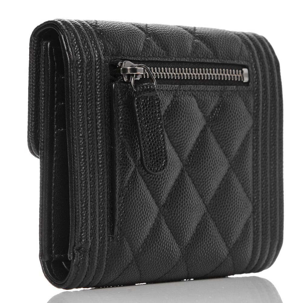 Crafted from luxurious diamond-quilted caviar leather in classic black, this stylish wallet features a small silver-tone Chanel CC lock on the front flap for a touch of elegance. Opening with a snap closure, the wallet unfolds to reveal a black interior trifold with card slots, bill folds, and a zippered coin compartment. Additionally, it boasts a convenient zippered coin compartment on the back exterior. Ideal for everyday use, this wallet combines practicality with the one-of-a-kind style synonymous with Chanel.