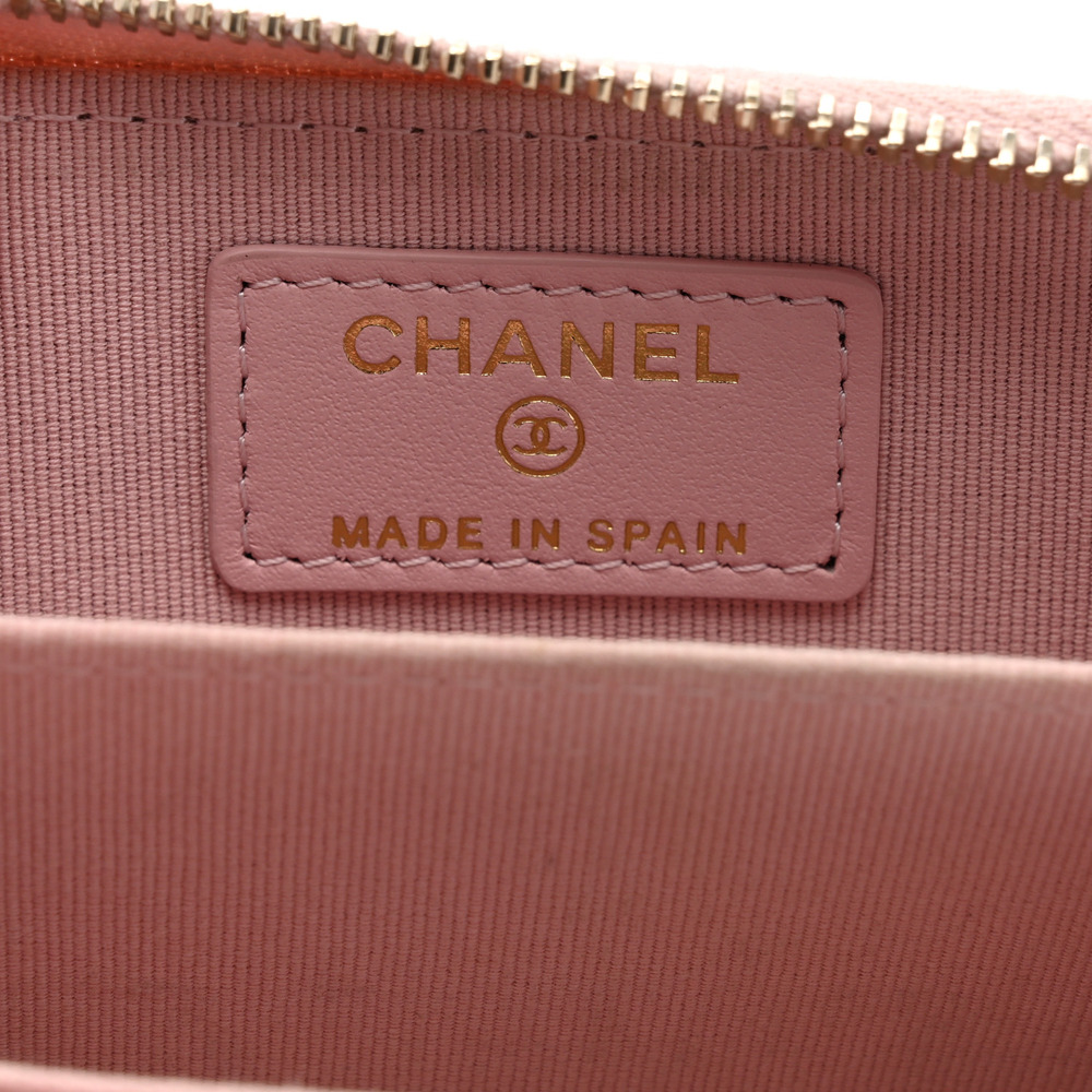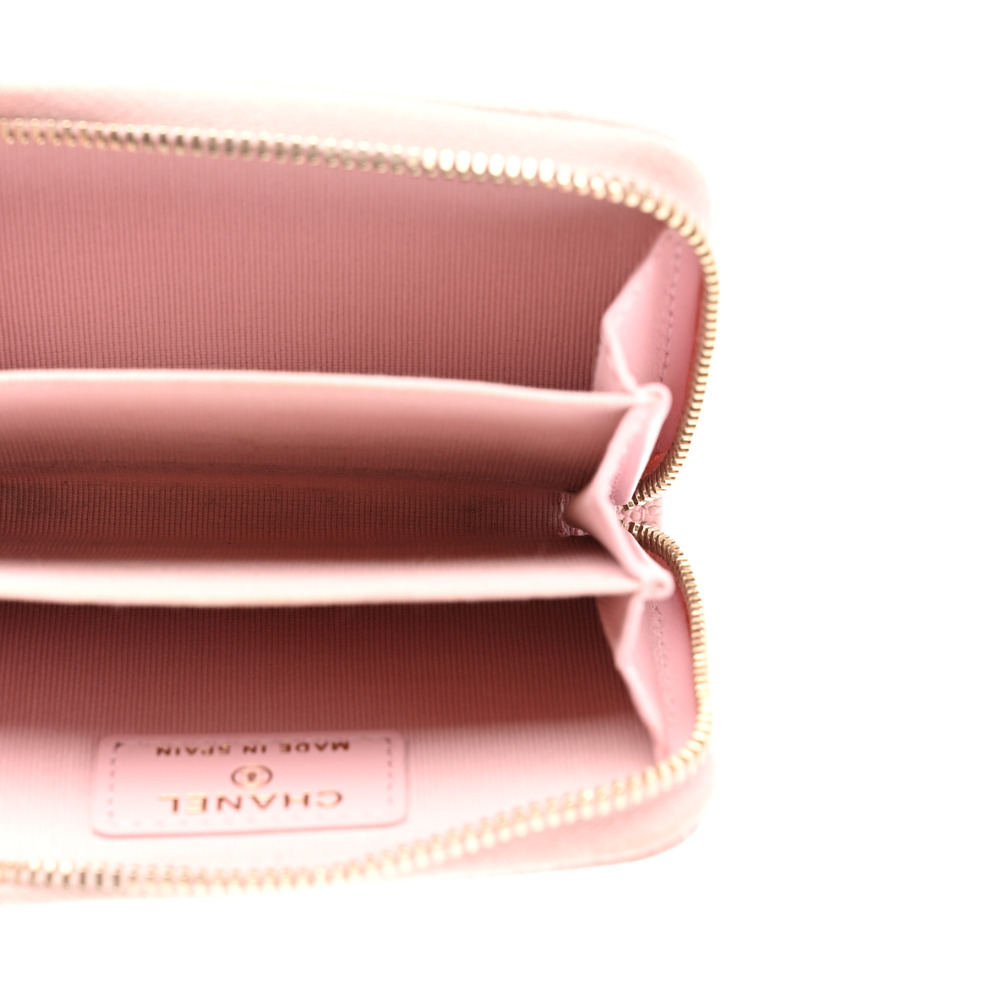 Crafted from pink caviar leather, this petite wallet exudes charm and elegance. The round coin purse design features a wrap-around zipper for secure closure and convenience. Adorning the front is a gold CC logo, adding a touch of sophistication. Opening the zipper reveals a matching pink fabric interior, providing a stylish backdrop for your essentials.