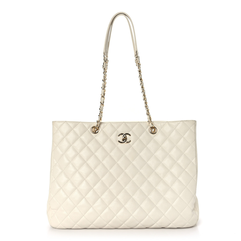 This Timeless tote bag is made of black calfskin with gold tone hardware; featuring the CC signature clasp, rear exterior slip pocket and interwoven gold tone chain link and black leather shoulder straps.