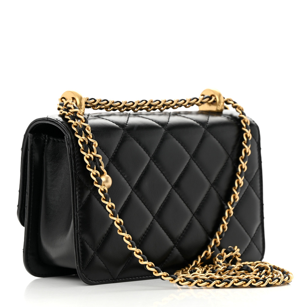This wallet is crafted of luxuriously soft diamond quilted lambskin leather in black. The handbag features a full light gold metal hardware plate with the Chanel logo cut out, a leather threaded light gold chain-link shoulder strap, and a facing flap with a light gold Chanel CC turn lock. The flap opens to a matching green leather and fabric interior with card slots, patch pockets, and a zipper compartment.