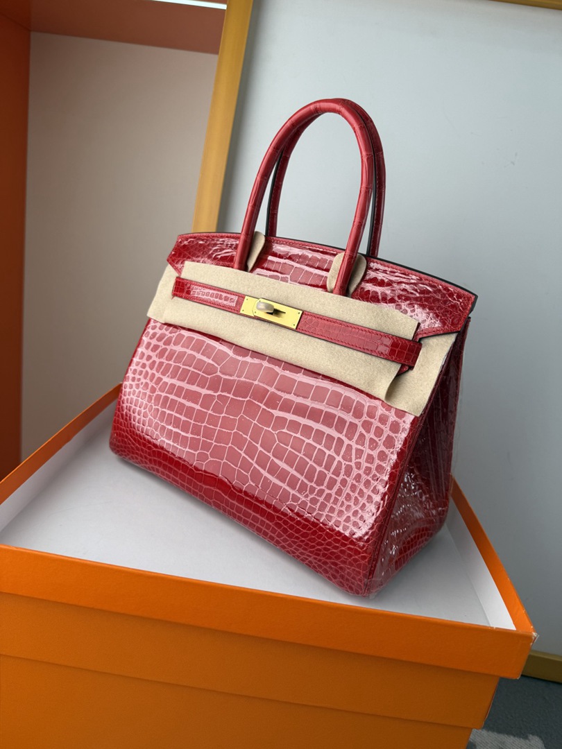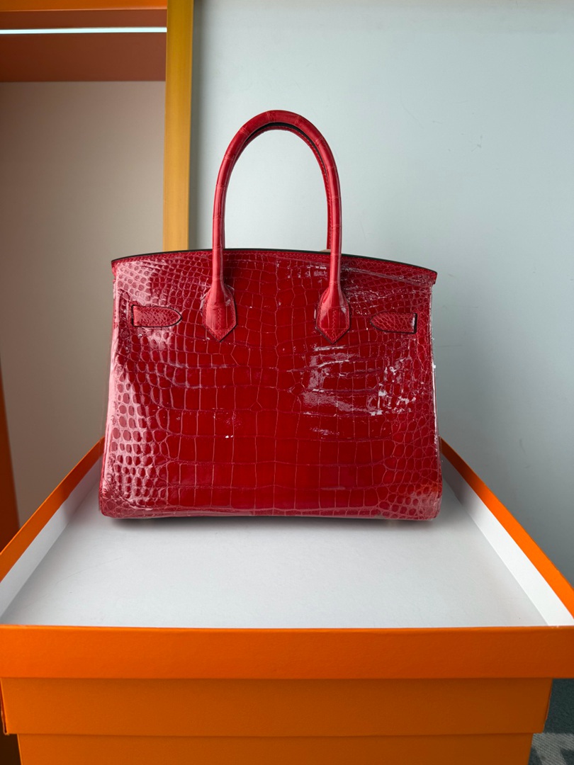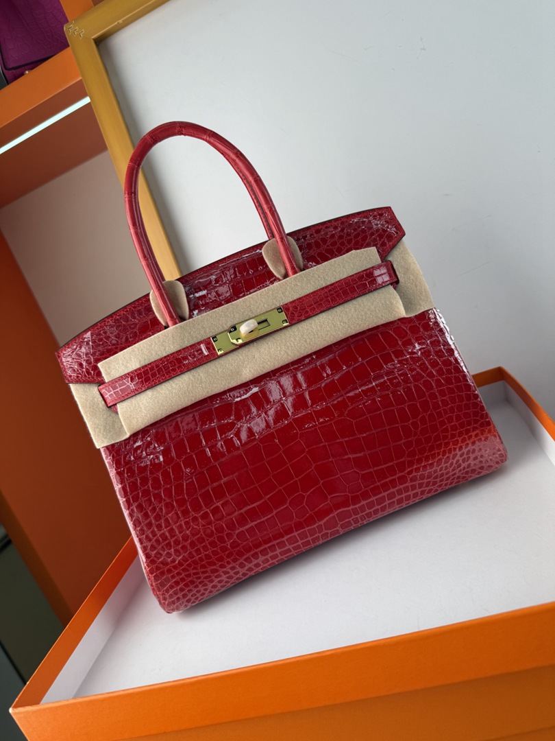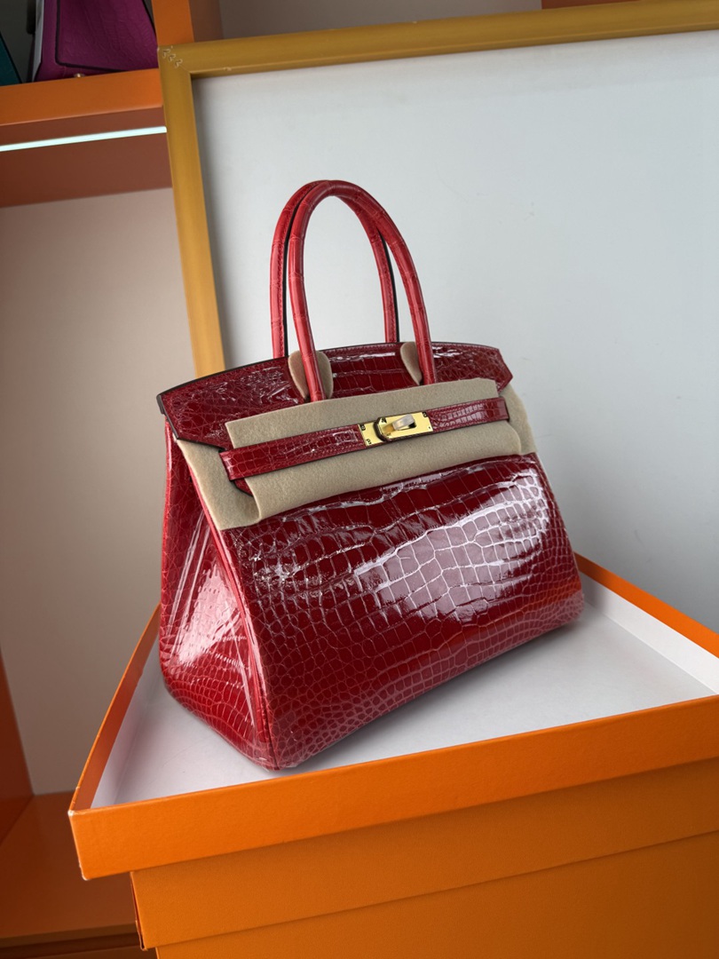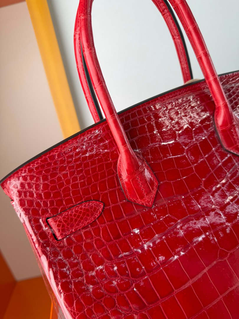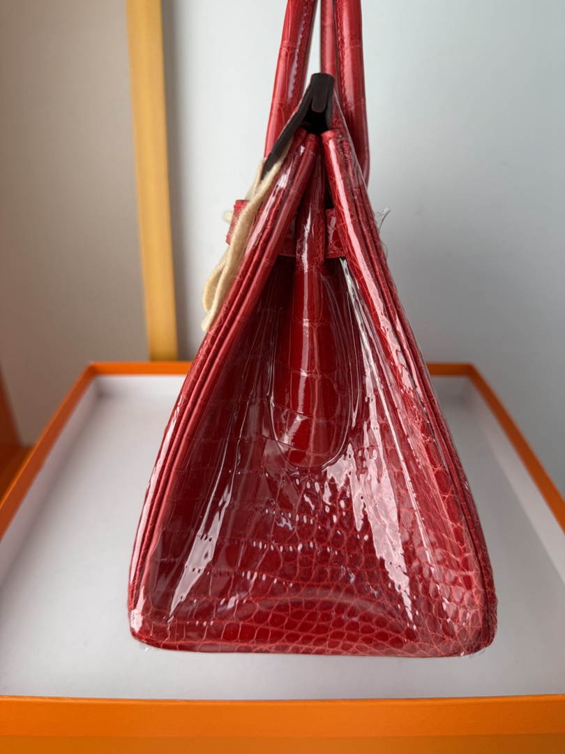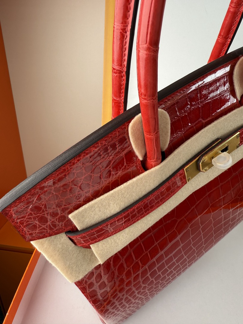 Hermes Birkin 25 Shiny Alligator Crocodile Handbag in Rouge Grenat