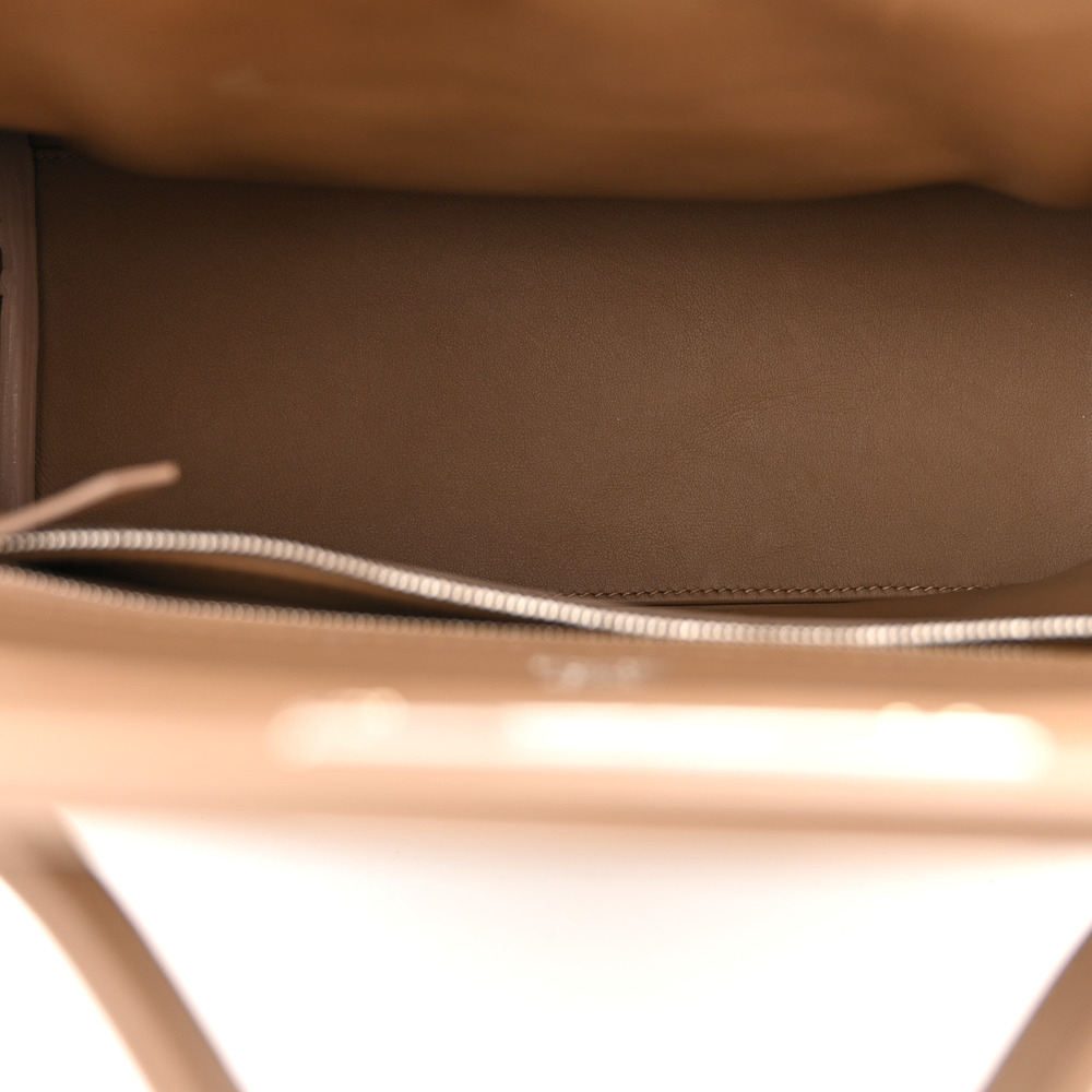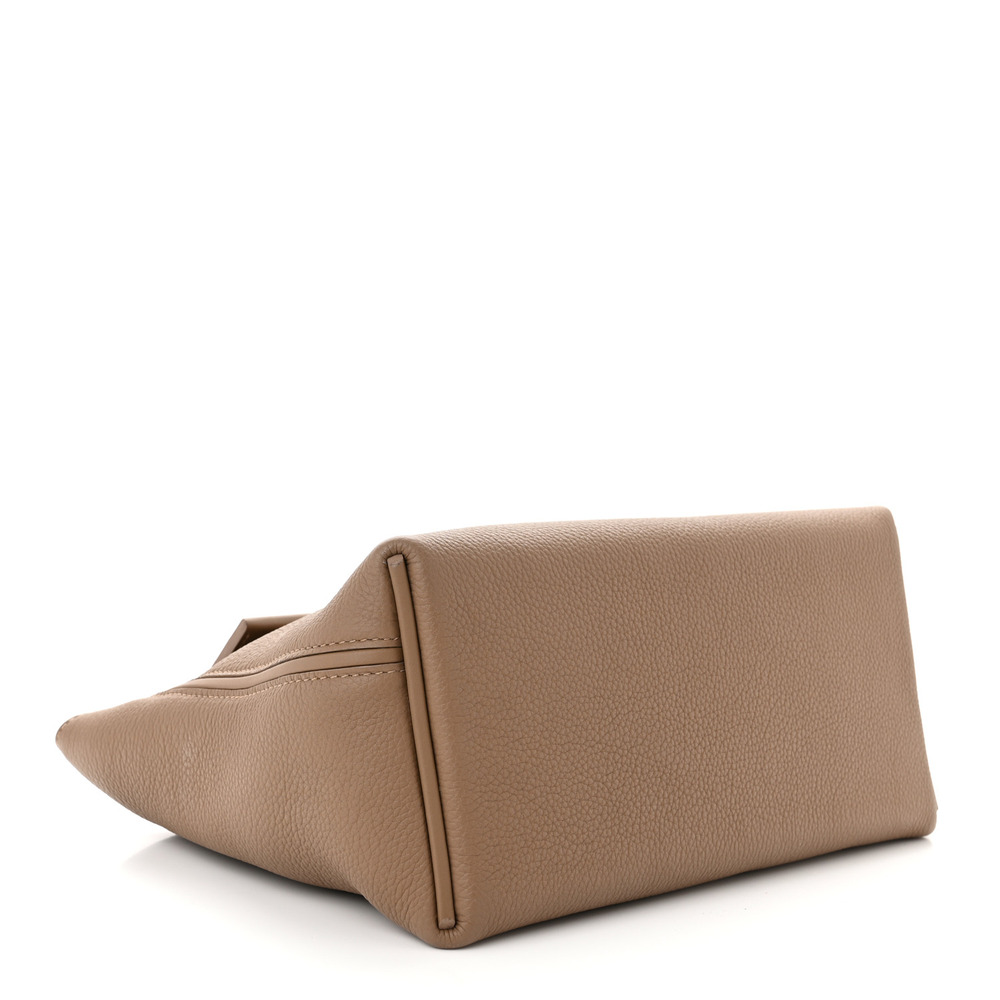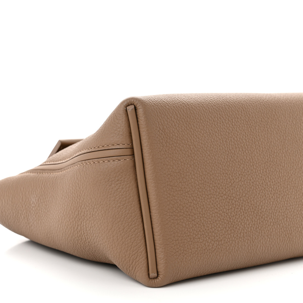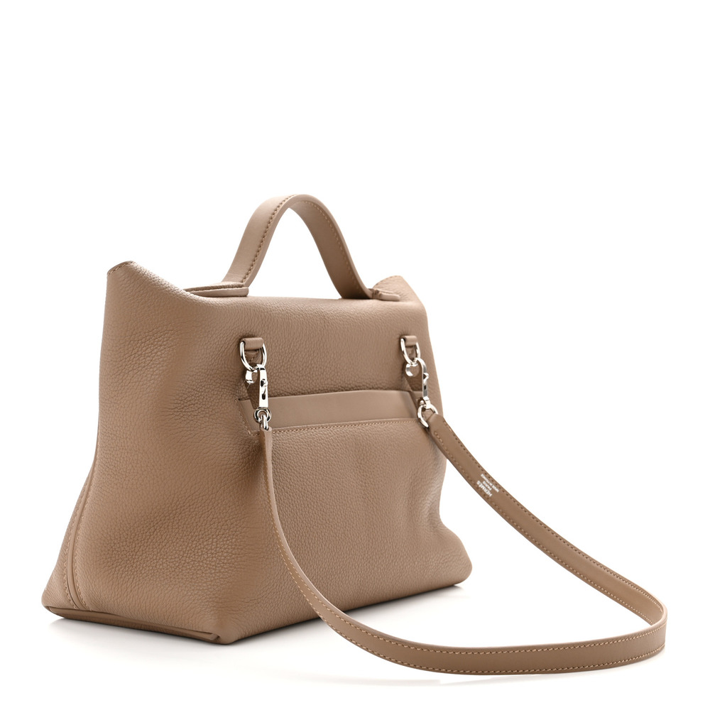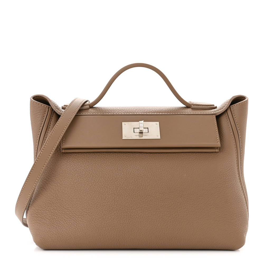 This handbag is crafted of richly textured Taurillon Maurice and swift leather in beige. The bag features a reinforced leather top handle, an optional leather shoulder strap, and silver hardware. This bag can also be styled as a belt bag. The flap opens to a matching smooth leather interior with a zipper pocket.