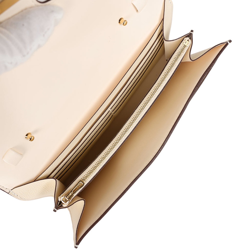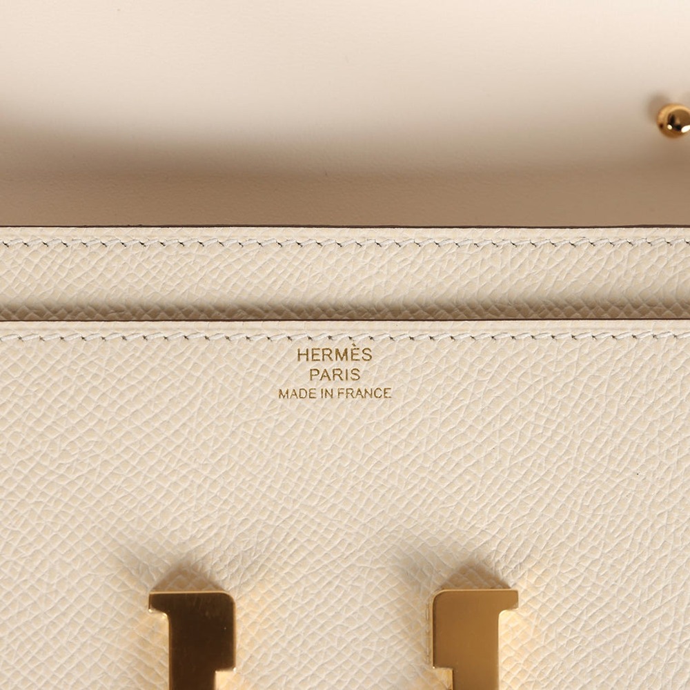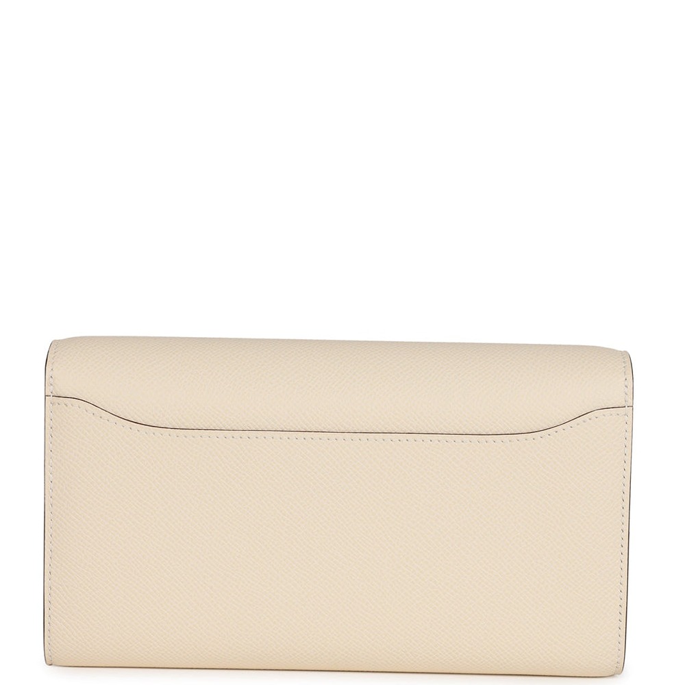 This Constance Wallet To Go is in off-white nata epsom leather with gold hardware and has tonal stitching, metal “H” snap lock closure, open front compartment and removable crossbody strap.The interior is lined with off-white leather and two main compartments with six credit card slots and a zippered center compartment with Hermes H lock pull.