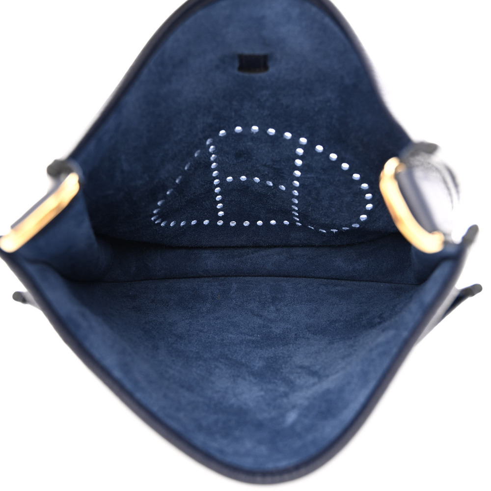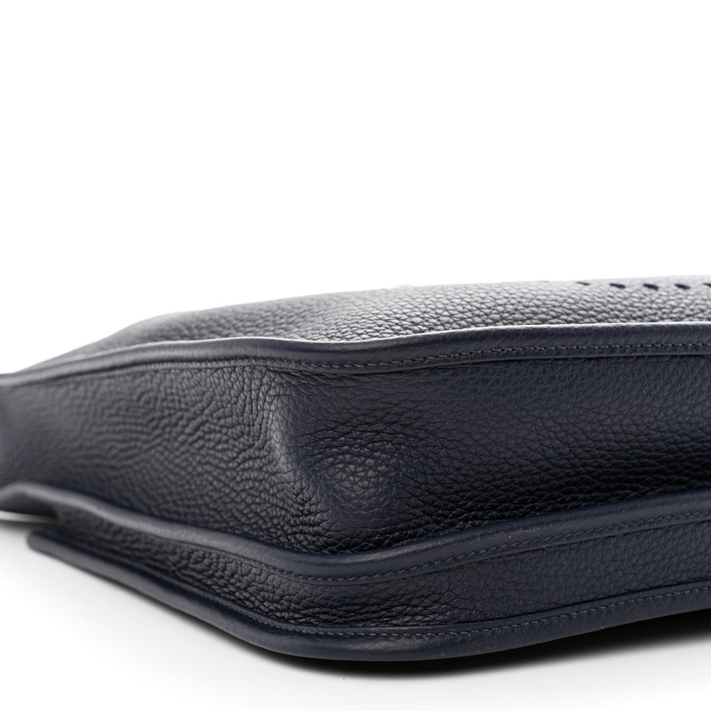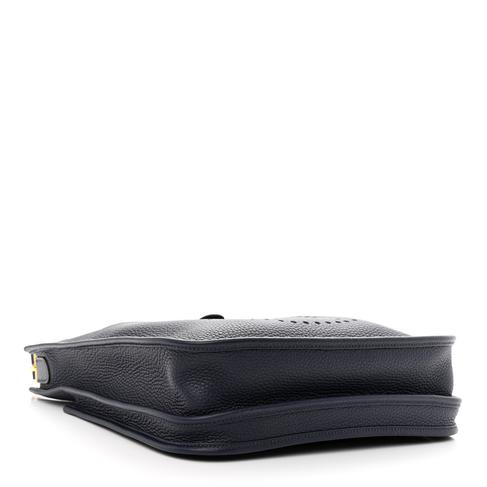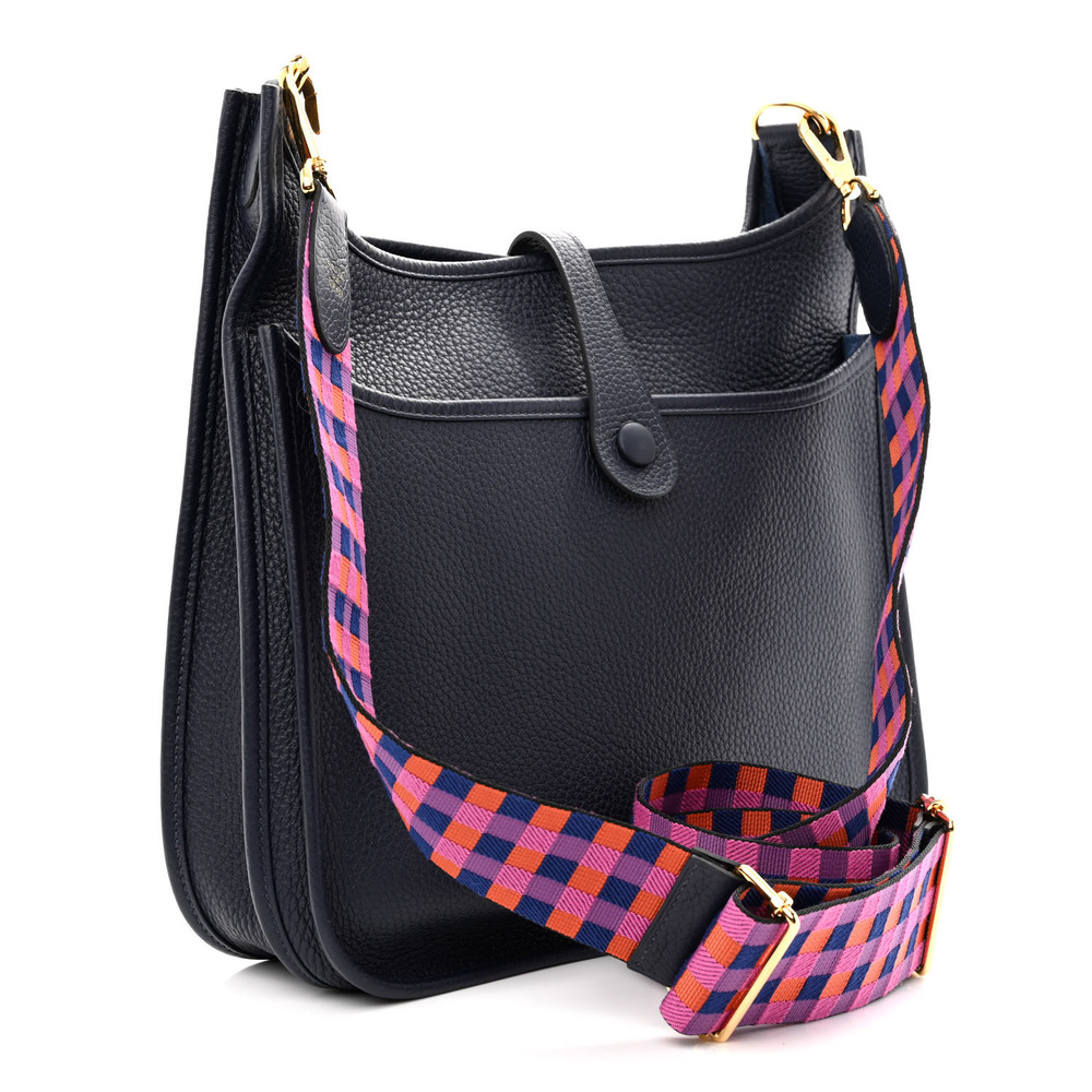 This Evelyne is in Vert Cypress Clemence leather with palladium hardware, has tonal stitching, pull tab top closure and a multicolored removable canvas and leather shoulder/crossbody strap.