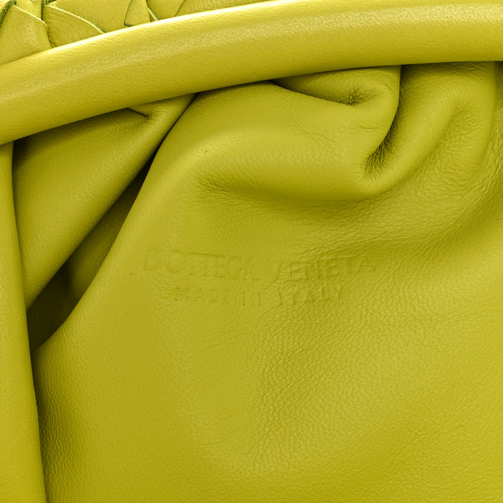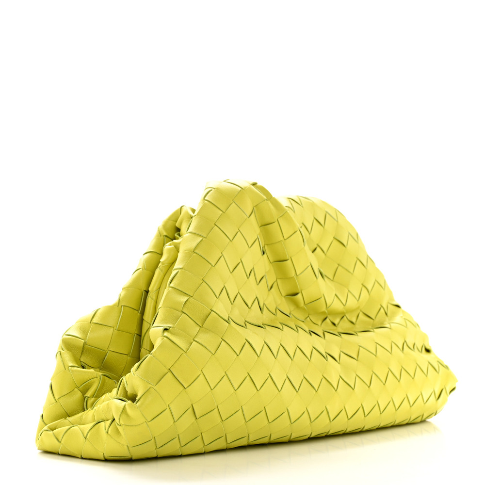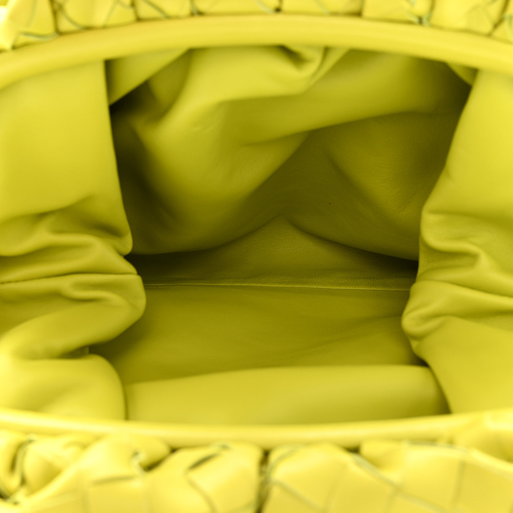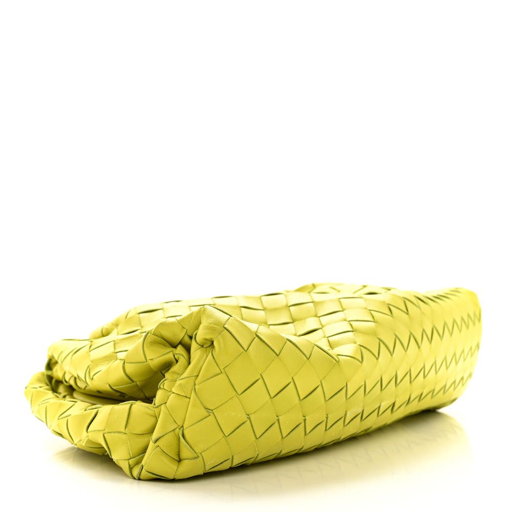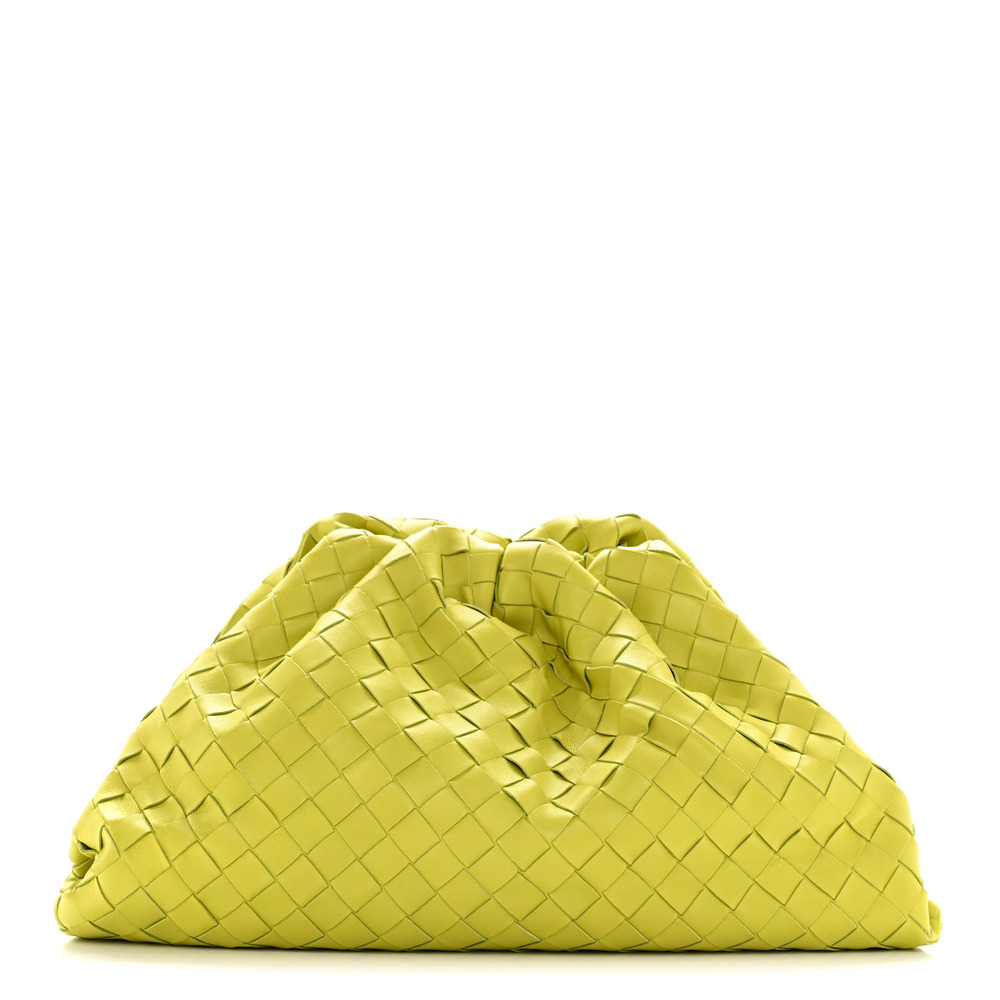 This stylish clutch is crafted of woven lambskin leather in lime green. The bag features a ruched leather magnetic top frame that opens to a matching leather interior.