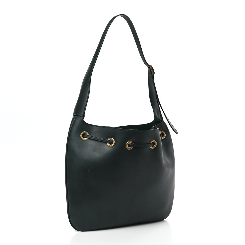 Crafted from luxurious calfskin in a rich green hue, this shoulder bag exudes sophistication. It boasts a looping leather shoulder strap adorned with brass hardware, adding a touch of elegance to the design. The top of the bag opens to reveal a spacious green suede interior, complemented by a matching removable pouch for added versatility and organization.