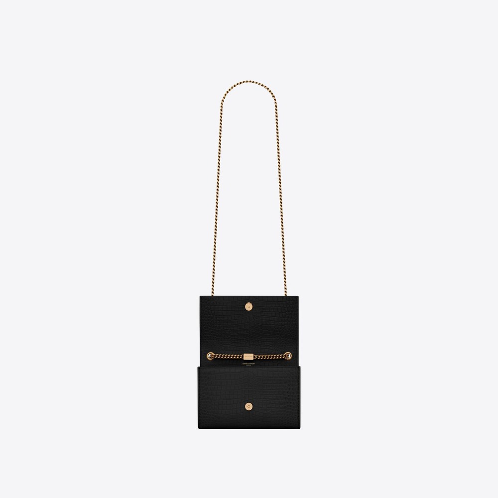 Meet the small, iconic Kate bag, reimagined in shiny crocodile-embossed leather for a luxurious touch. This timeless piece features the iconic Cassandre logo and a chain tassel, adding a touch of sophistication to its design. The long, curb-link chain strap offers versatility, allowing you to wear it in several ways to suit your style.