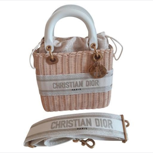 The Lady Dior bag epitomizes Dior’s vision of elegance and beauty. The timeless creation is traditionally crafted in natural hand-woven wicker and exemplifies Dior’s savoir-faire. The bag features a blue Dior Oblique jacquard interior pouch with a drawstring as well as a Christian Dior Paris embroidered band on the front. Antique gold-finish metal D.I.O.R. charms offer an elegant allure. The medium Lady Dior bag, with its wide, removable leather shoulder strap, can be carried by hand or worn crossbody.