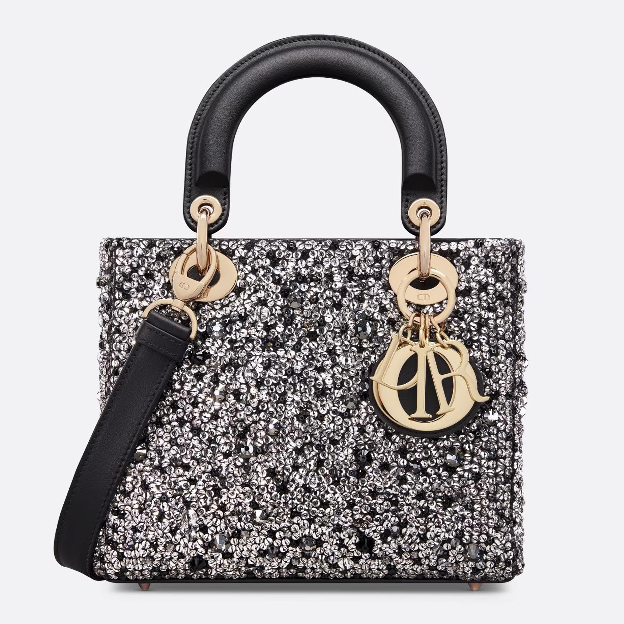 The Lady Dior bag showcases the House’s vision of elegance and beauty. Refined and sleek, the creation is timeless. Crafted in black embroidered satin, the exceptional design is fully covered in strass of varying sizes and tones of silver, offering three-dimensional luminosity. The pale gold-finish metal D.I.O.R. charms enhance and illuminate the silhouette. Featuring a thin, removable leather strap, the small Lady Dior bag can be carried by hand or worn crossbody.