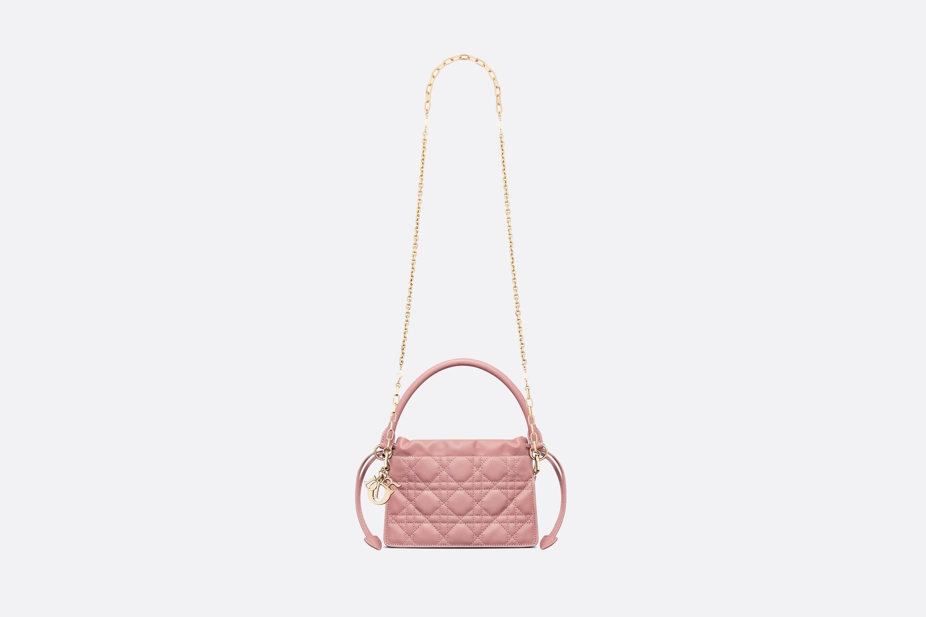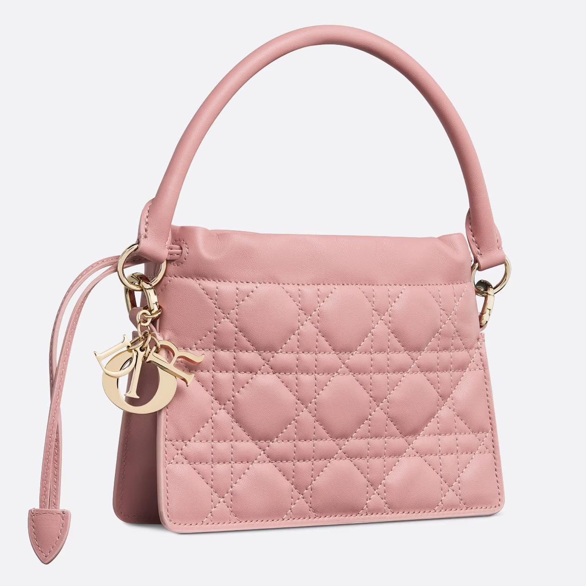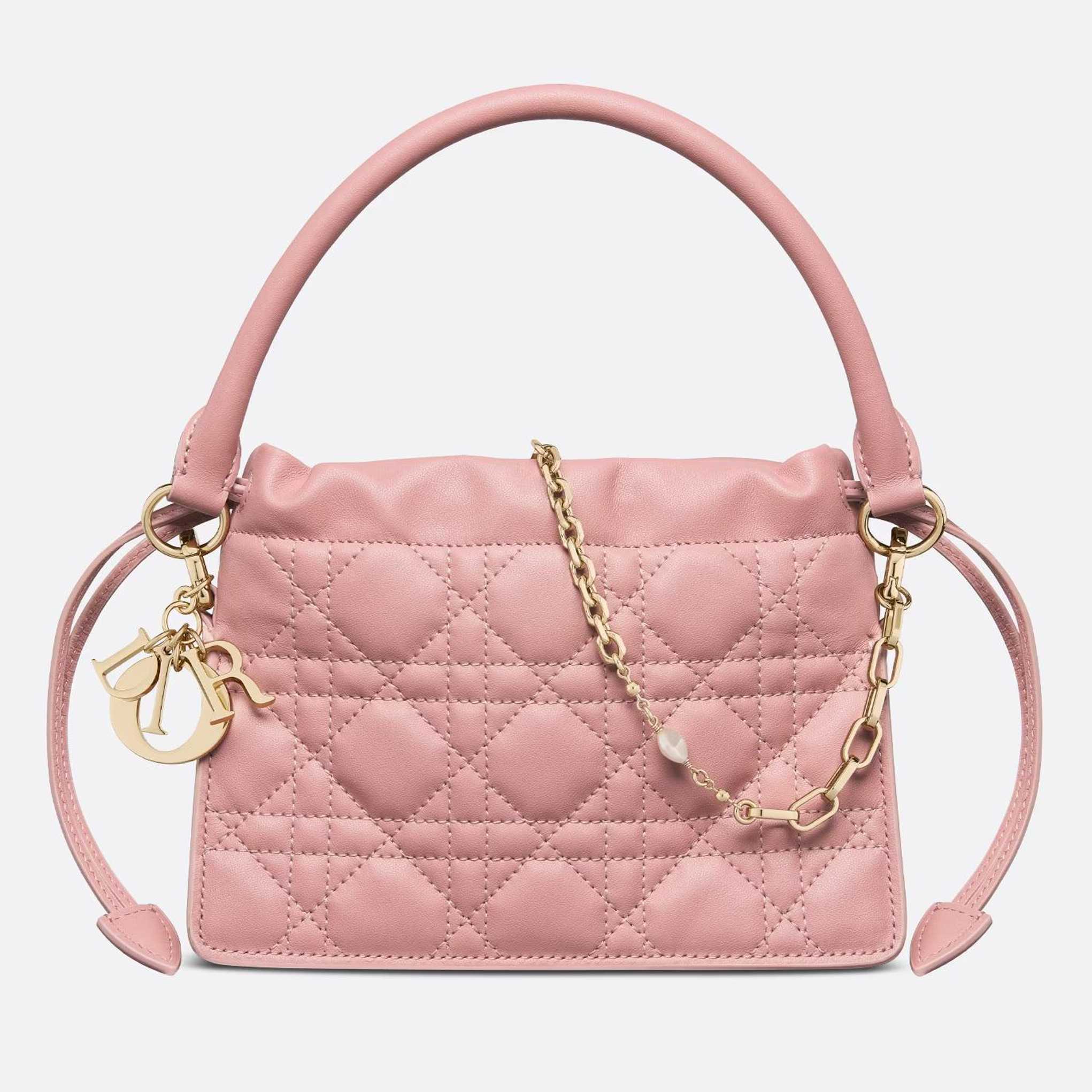 The sophisticated, retro-style Milly mini bag elevates the Lady Dior line. Crafted in antique pink Cannage lambskin, it features a D.I.O.R. charm and a drawstring cord closure. The removable leather handle is completed by a detachable chain punctuated with beads, allowing the bag to be carried by hand or worn crossbody.