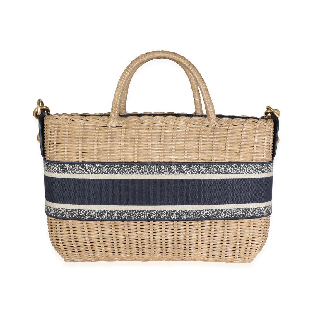 This is an authentic Christian Dior??Oblique Wicker jacquard Basket bag in Beige and Navy. This stylish??basket bag is decorated with the maison’s jacquard logo motif in navy blue and ecru tones. The piece features a detachable shoulder strap for added styling options.??