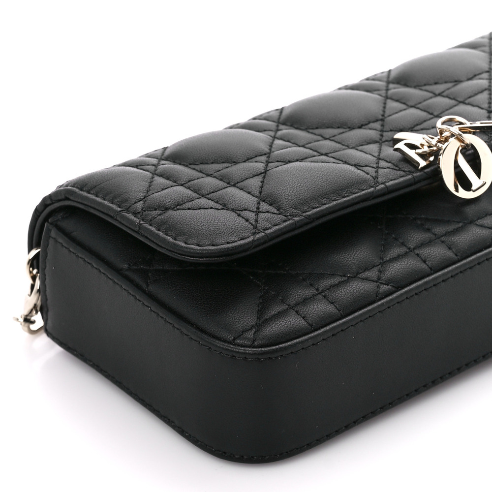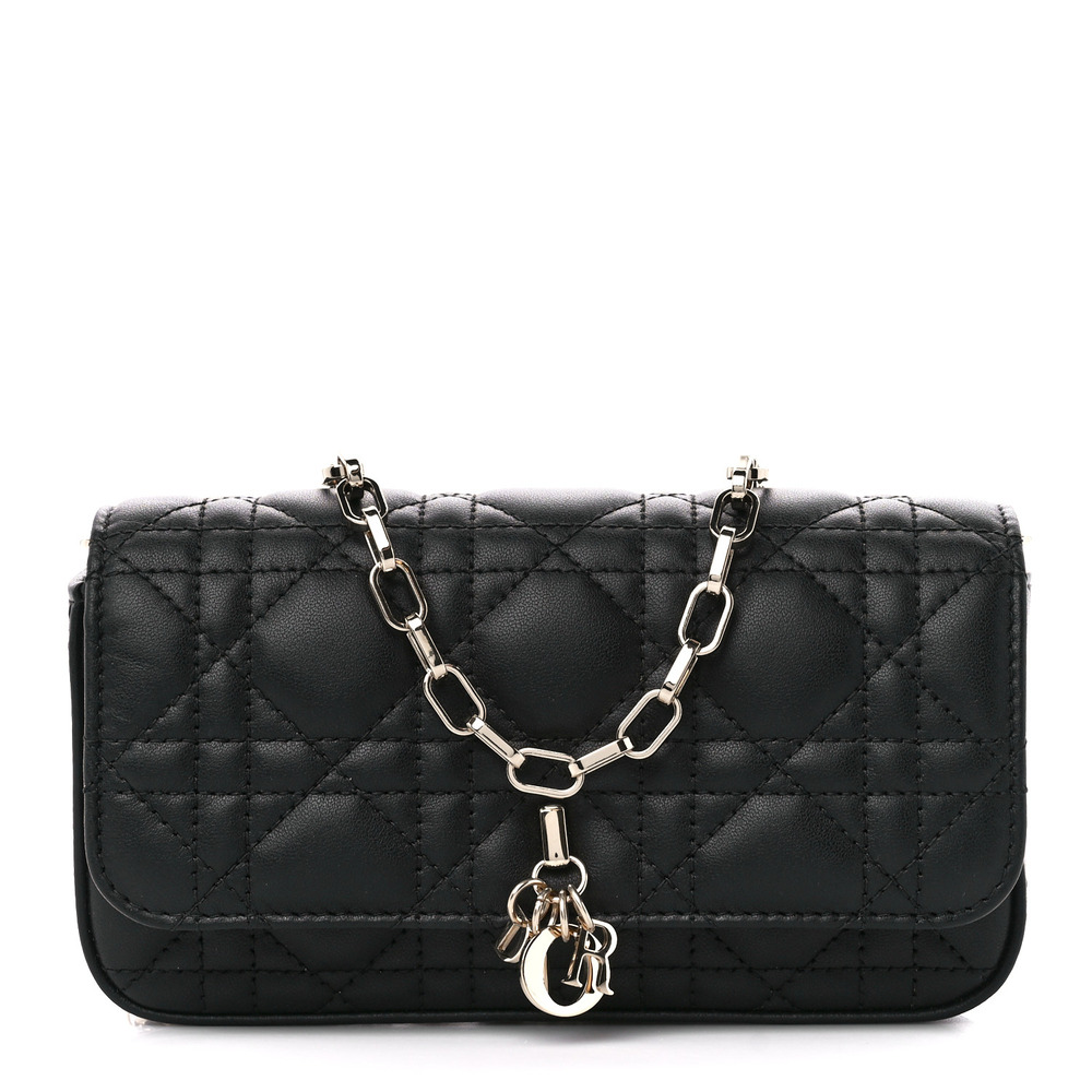 The Lady Dior phone pouch is a clever and sophisticated creation. Crafted in black Cannage lambskin, it features a pale gold-finish metal D.I.O.R. charm. Completed by an elegant removable chain punctuated with resin pearls, the phone pouch can be carried by hand, worn over the shoulder or crossbody.