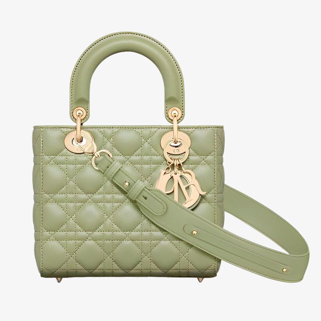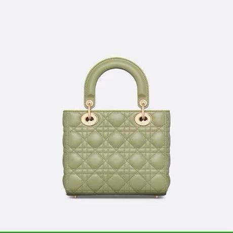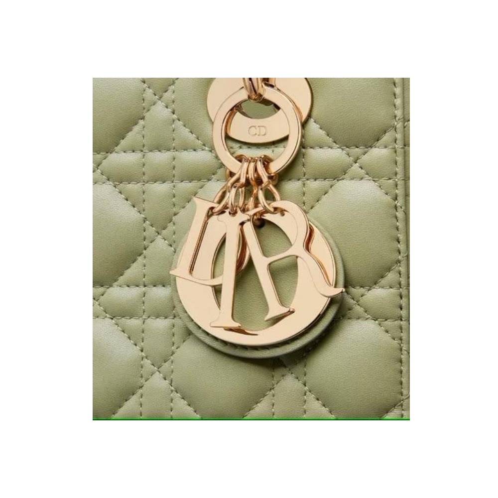 The Lady Dior My ABCDior bag epitomizes the House?s vision of elegance and beauty. Sleek and refined, the timeless style is crafted in Ethereal green lambskin with Cannage stitching,while the pale gold-finish metal D.I.O.R. charms embellish and illuminate the silhouette.