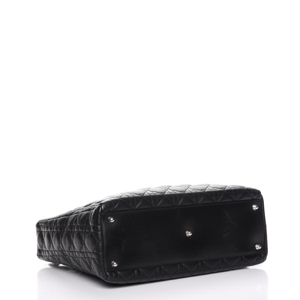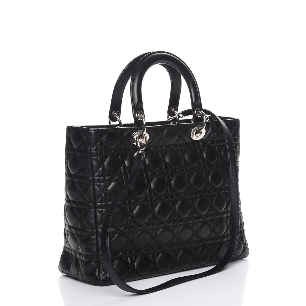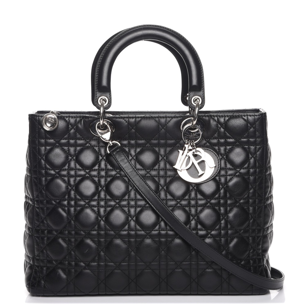 The Lady Dior bag embodies Dior’s vision of elegance and beauty. Refined and sleek, the timeless style is crafted in sand pink lambskin with Cannage stitching, creating the instantly recognizable quilted texture. Pale gold-finish metal D.I.O.R. charms offer elegant appeal. Featuring a removable thin leather shoulder strap, the large Lady Dior bag can be carried by hand or worn crossbody.
