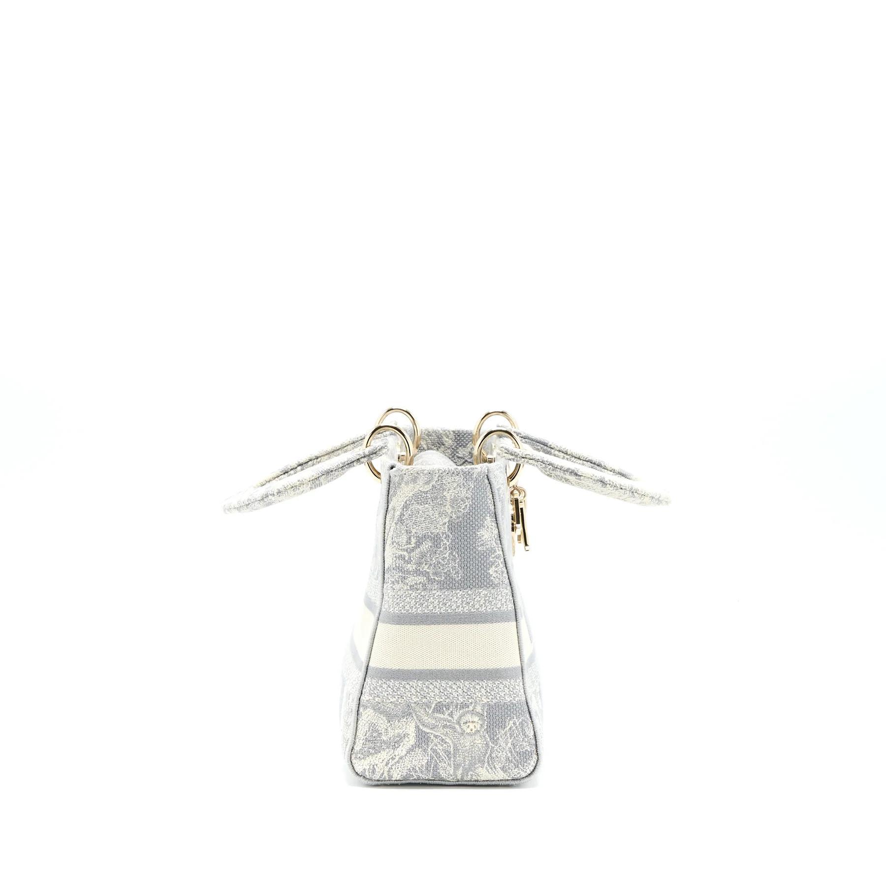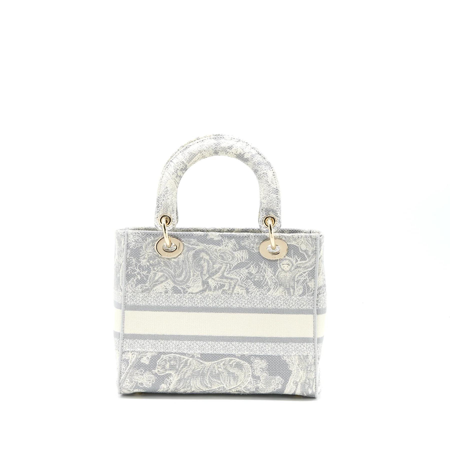The Lady D-Lite bag is a reinterpretation of the iconic Lady Dior bag. It is made of embroidered canvas with a removable shoulder strap and a top handle. The bag has a spacious interior with a zipper pocket.