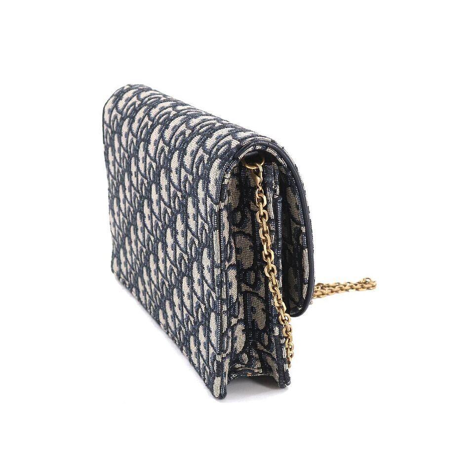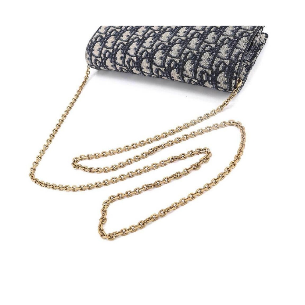The long Saddle wallet with chain, crafted in blue Dior Oblique jacquard, is a hybrid item with a modern and streamlined design. The style is embellished with an asymmetric flap featuring an antique gold-finish metal D stirrup