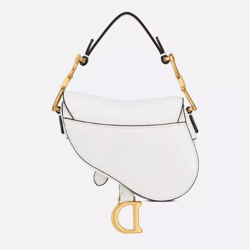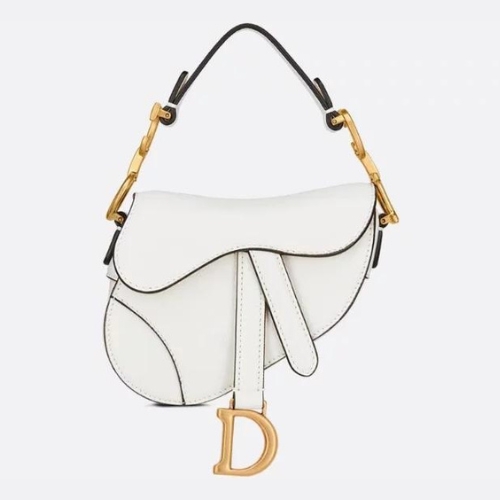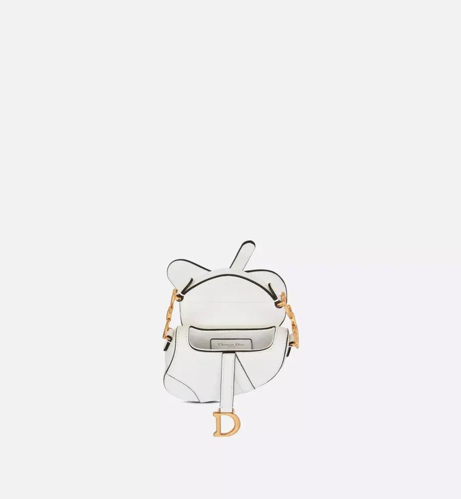 Maria Grazia Chiuri brings a fresh update to the iconic Saddle bag with a miniature version. Crafted in latte goatskin, its legendary design features a Saddle flap with an antique gold-finish metal ?D? stirrup and a ?CD? signature on each side of the strap The micro Saddle bag can be personalized with different embroidered shoulder straps from the House.