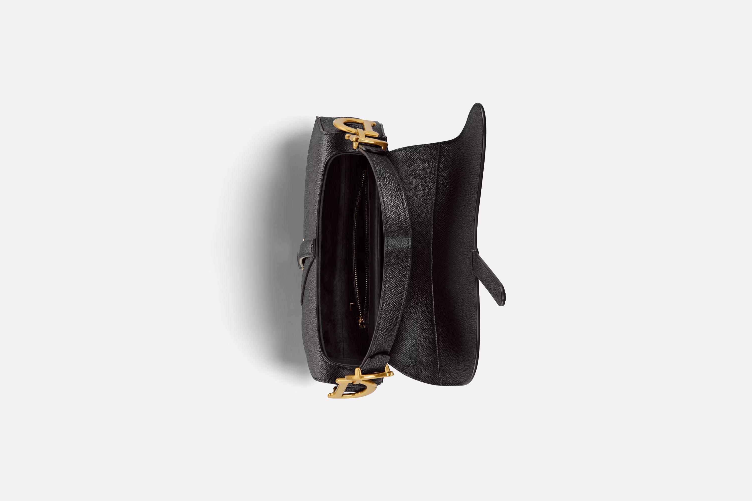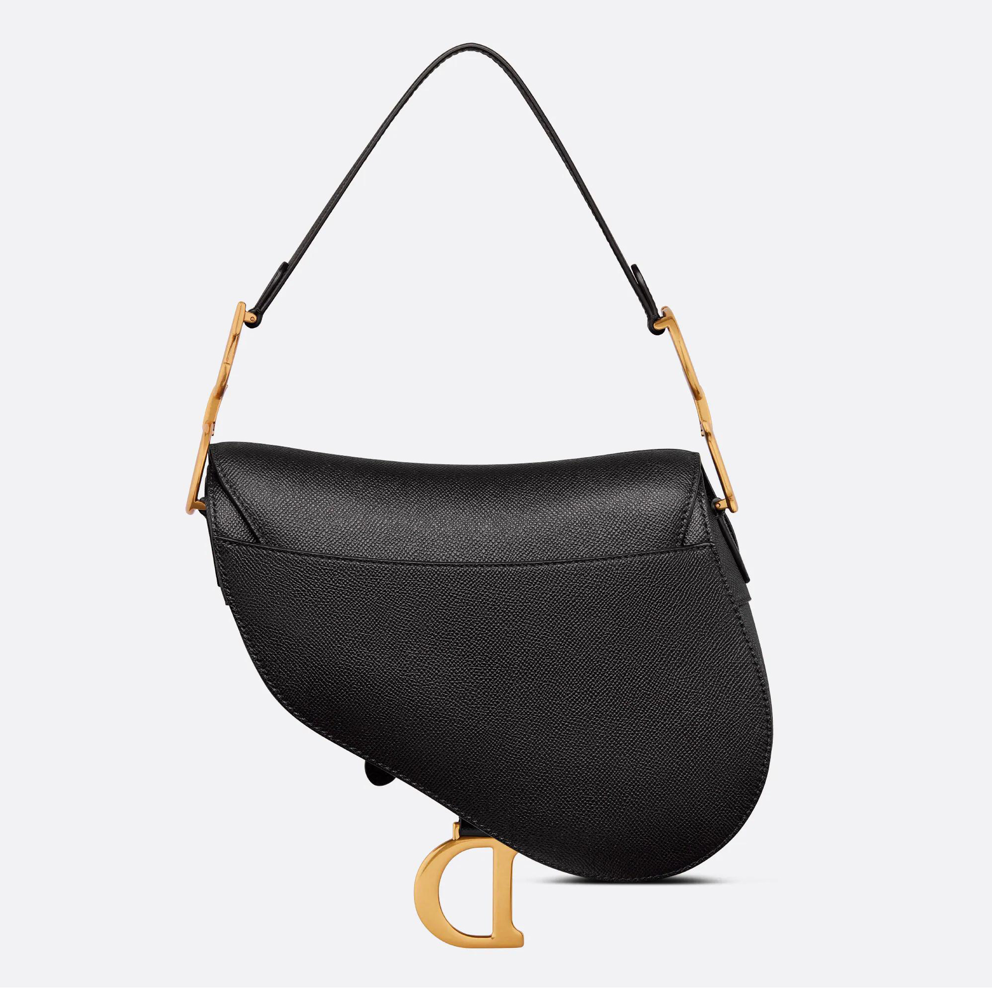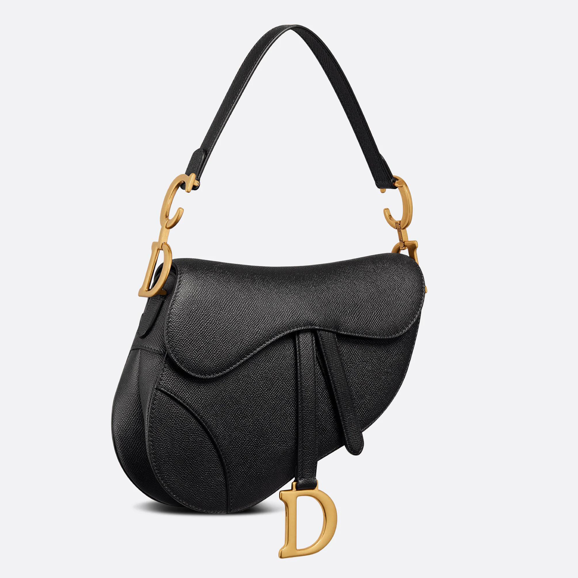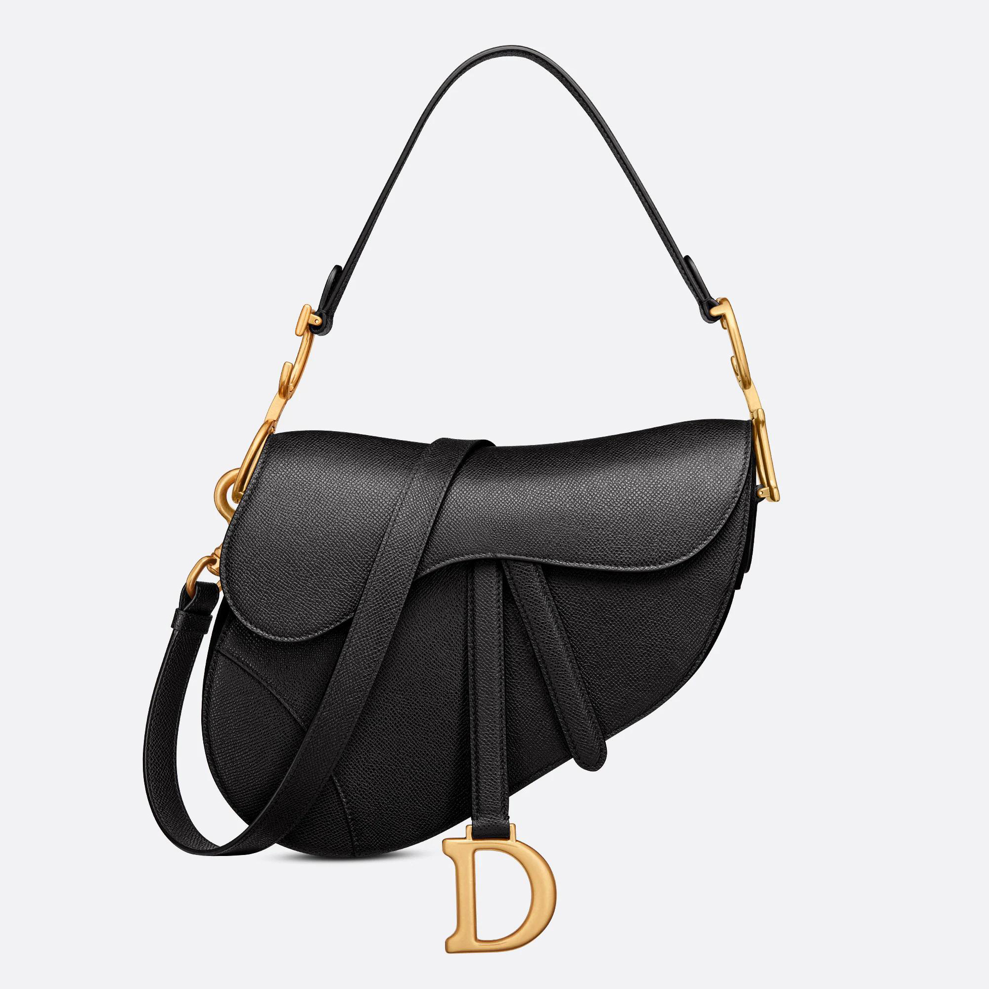 Maria Grazia Chiuri brings a fresh update to the iconic Saddle bag. Crafted in black grained calfskin, the legendary design features a Saddle flap with a D stirrup clasp on a magnetic strap, as well as an antique gold-finish metal CD signature on either side of the strap. Equipped with a thin, adjustable and removable shoulder strap, the Saddle bag may be carried by hand, worn over the shoulder or crossbody.