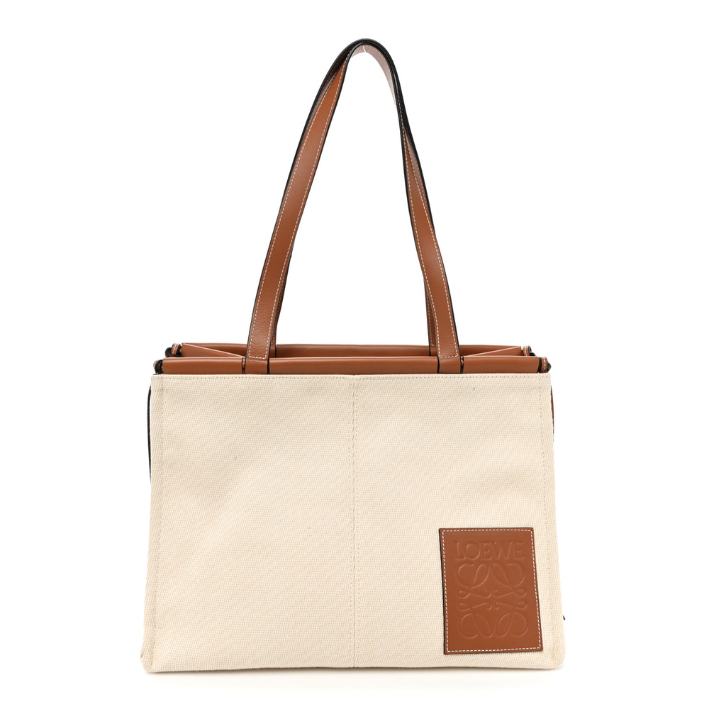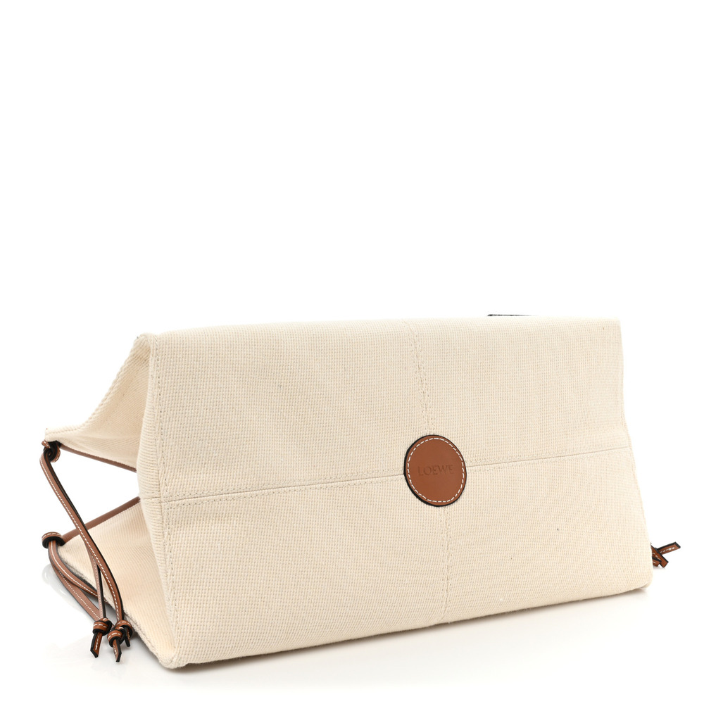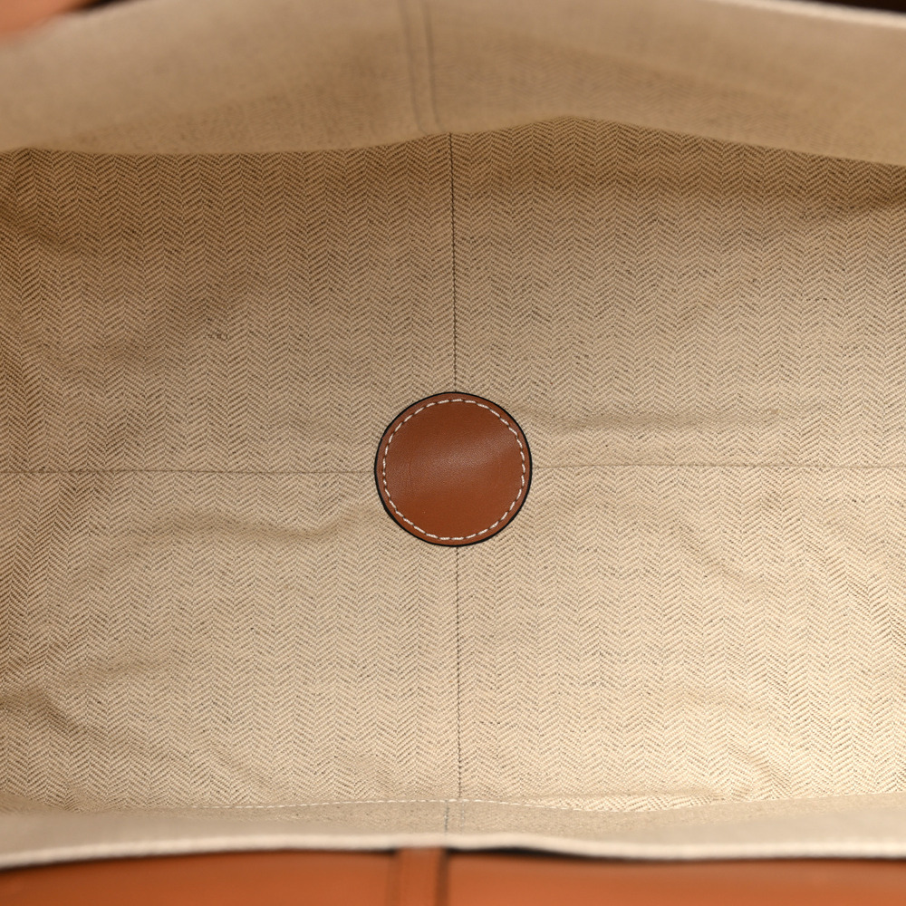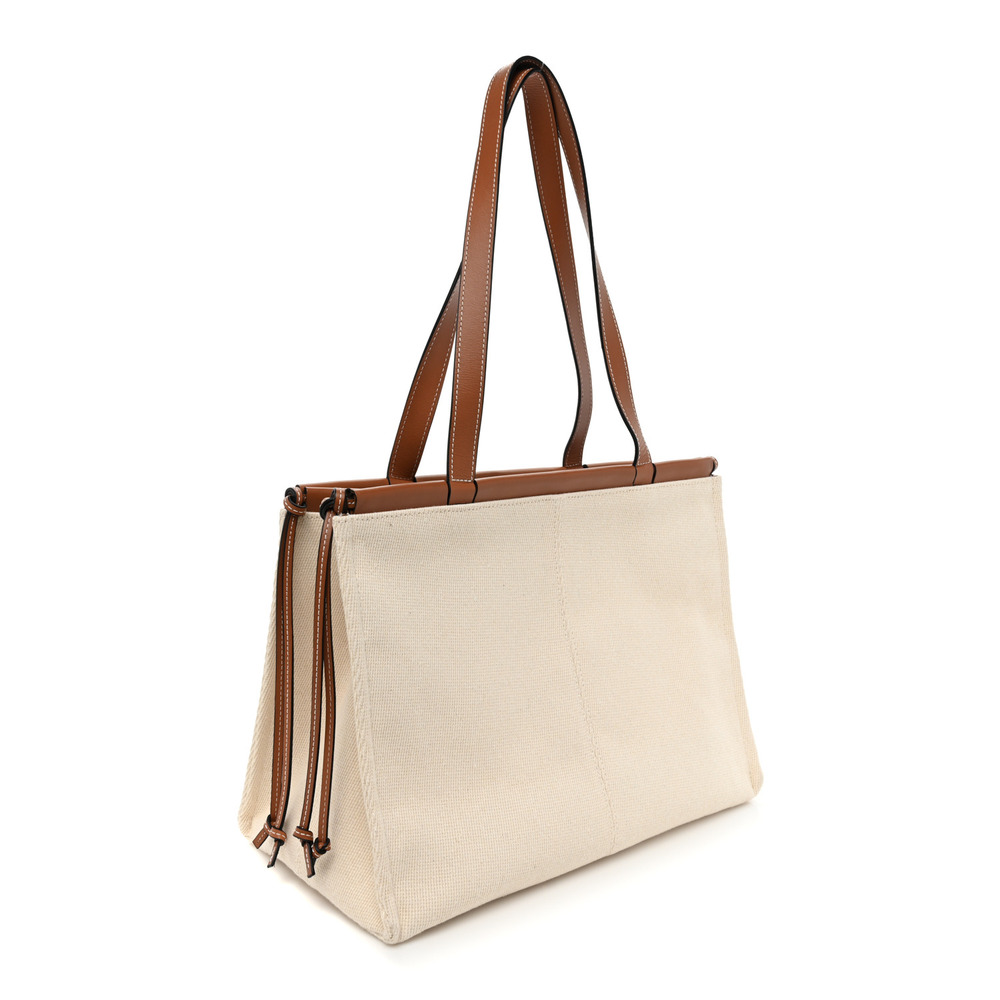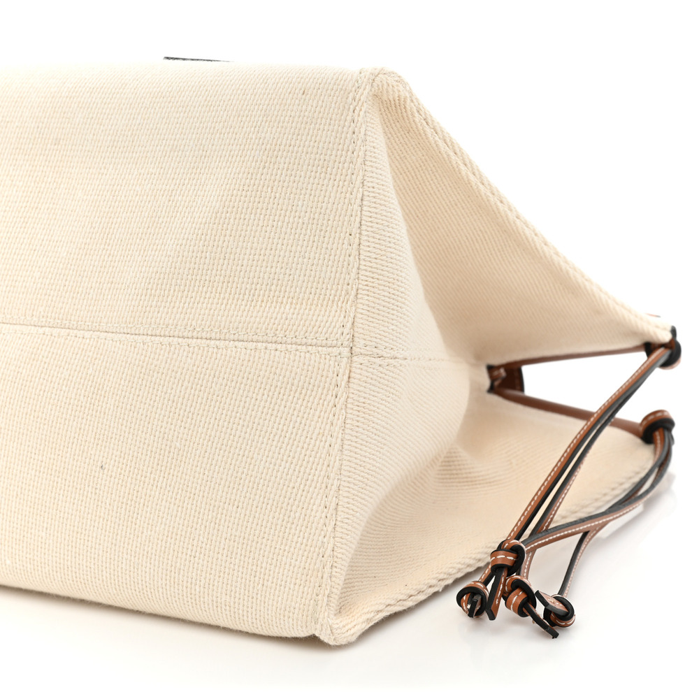 Canvas tote in off-white. Buffed calfskin trim in tan with burnished edges in black throughout. Twin carry handles at top. Buffed calfskin logo appliqu?? in tan at face. Leather drawstrings and magnetic tab fastenings at throat. Patch pockets and embossed logo at interior. Herringbone lining.